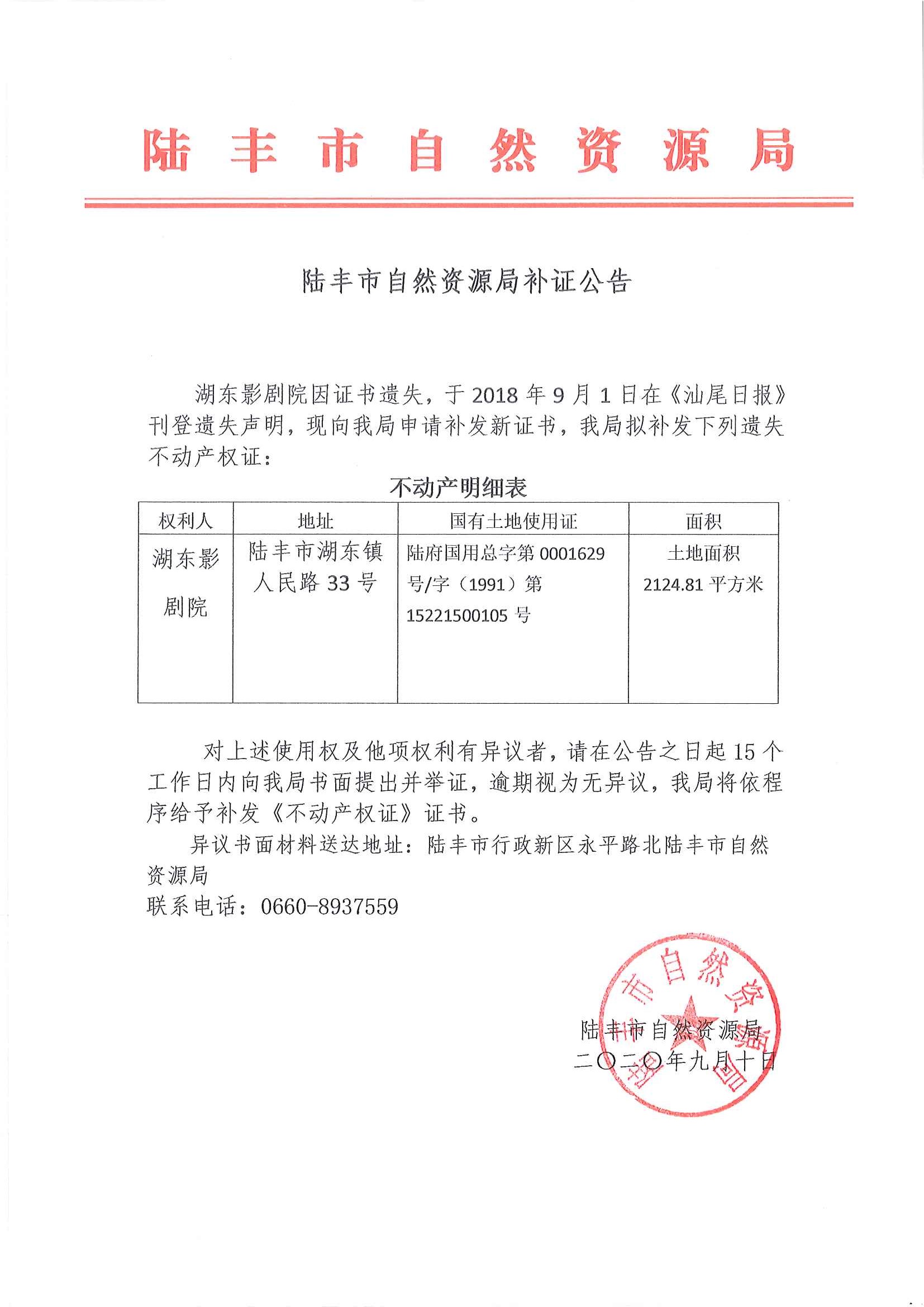 陸豐市自然資源局補(bǔ)證公告(湖東影劇院)