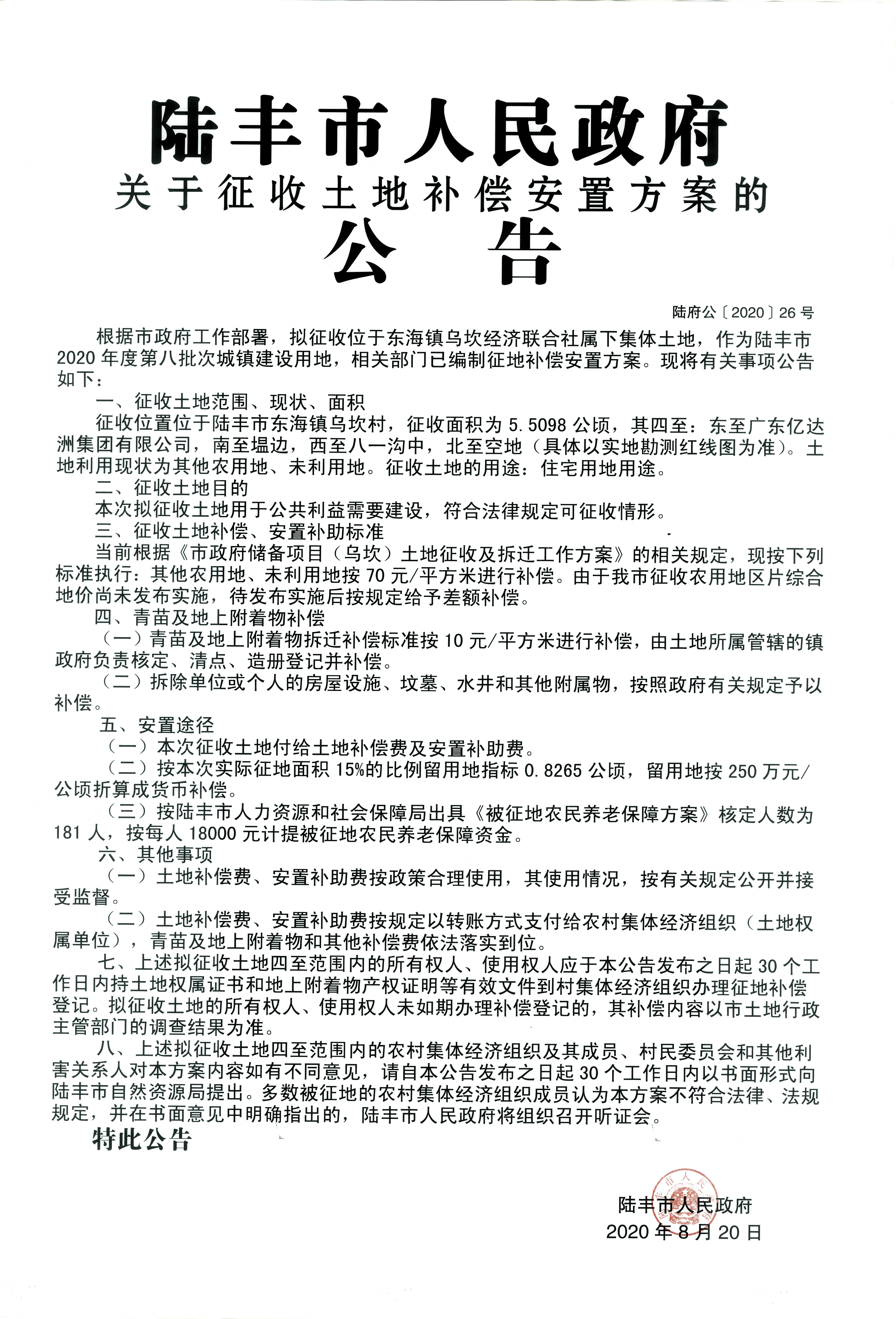 陸豐市人民政府關(guān)于征收土地補(bǔ)償安置方案的公告-陸府公(2020)26號(hào)