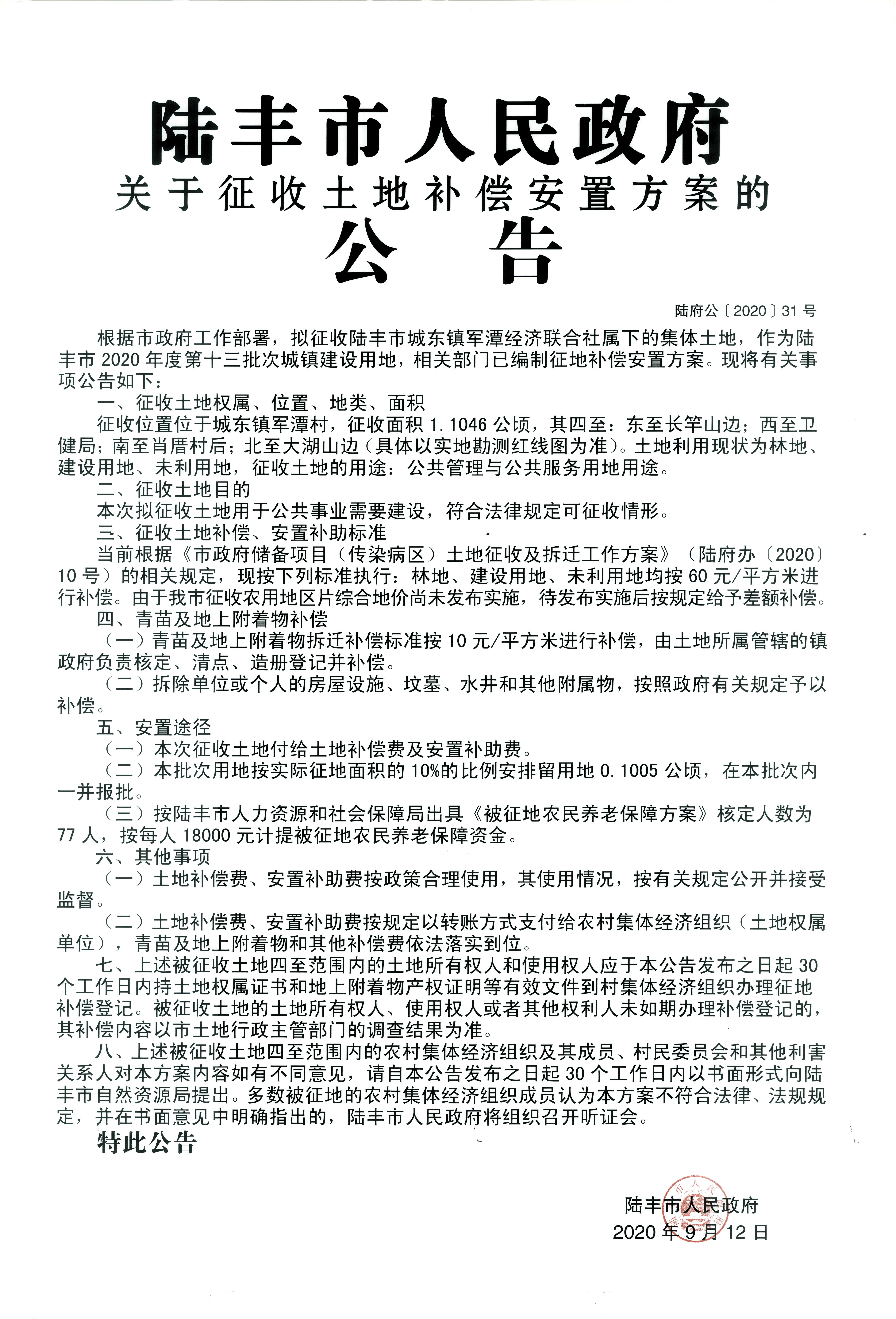 陸豐市人民政府關(guān)于征收土地補(bǔ)償安置方案的公告-陸府公(2020)31號(hào)