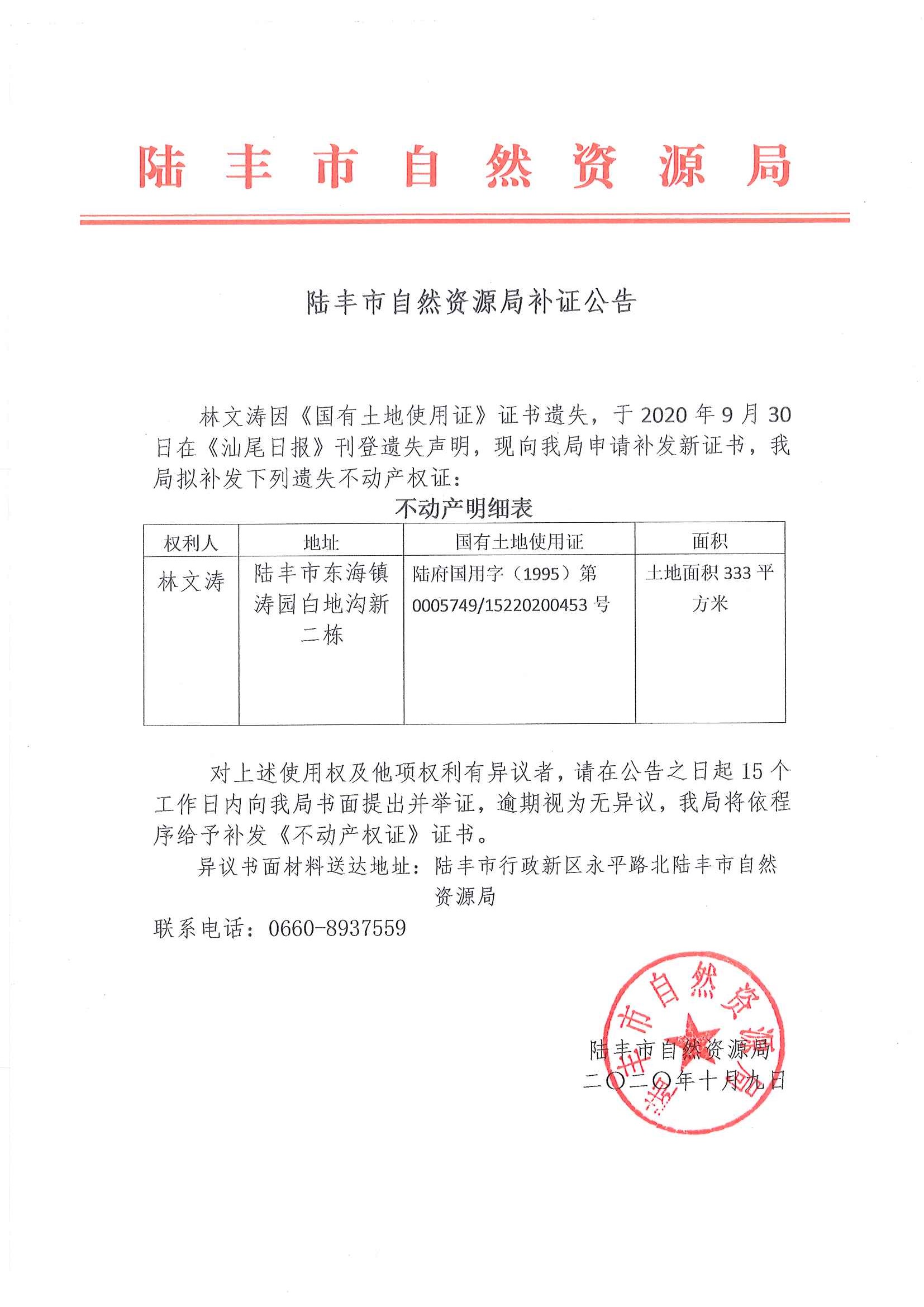 陸豐市自然資源局補(bǔ)證公告(林文濤)