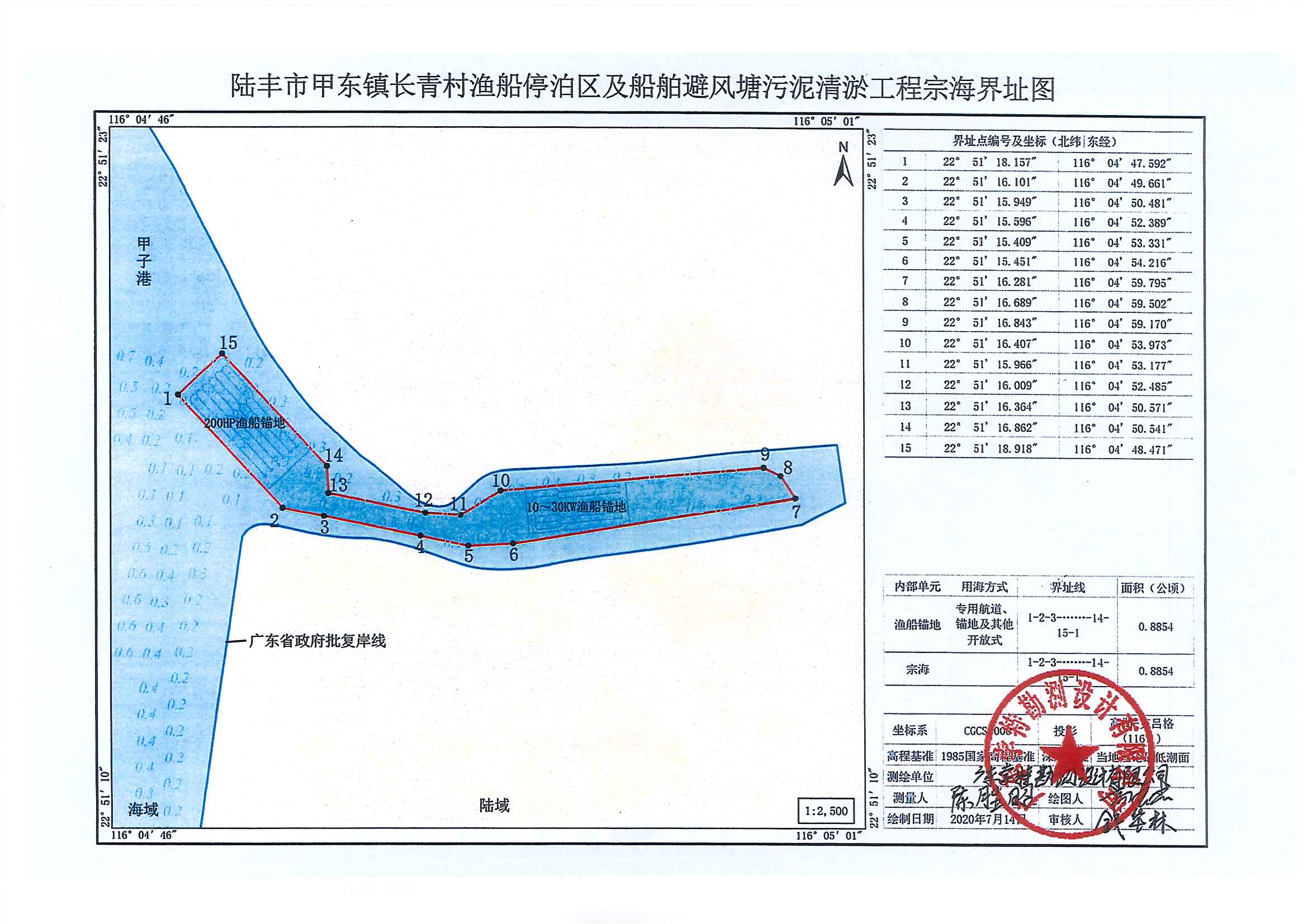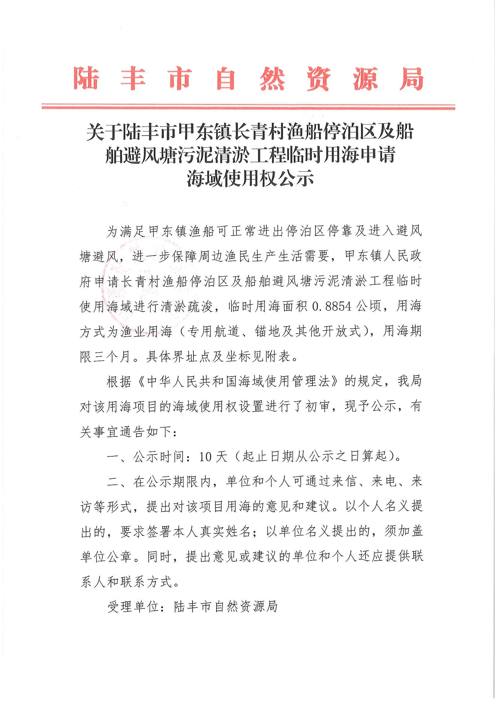關(guān)于陸豐市甲東鎮(zhèn)長(zhǎng)青村漁船停泊區(qū)及船舶避風(fēng)塘污泥清淤工程臨時(shí)用海申請(qǐng)海域使用權(quán)的公示