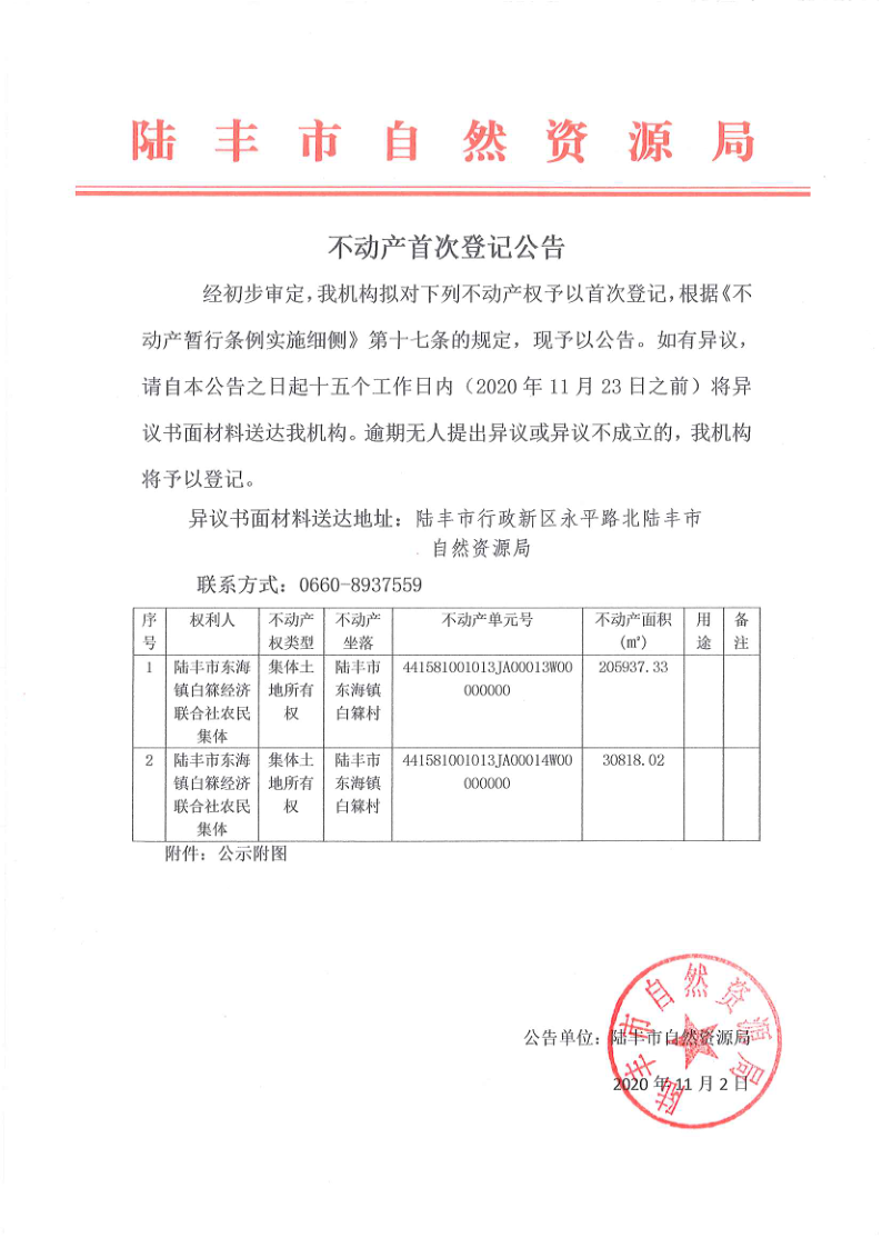 不動(dòng)產(chǎn)首次登記公示(陸豐市東海鎮(zhèn)白箖經(jīng)濟(jì)聯(lián)合社農(nóng)民集體)