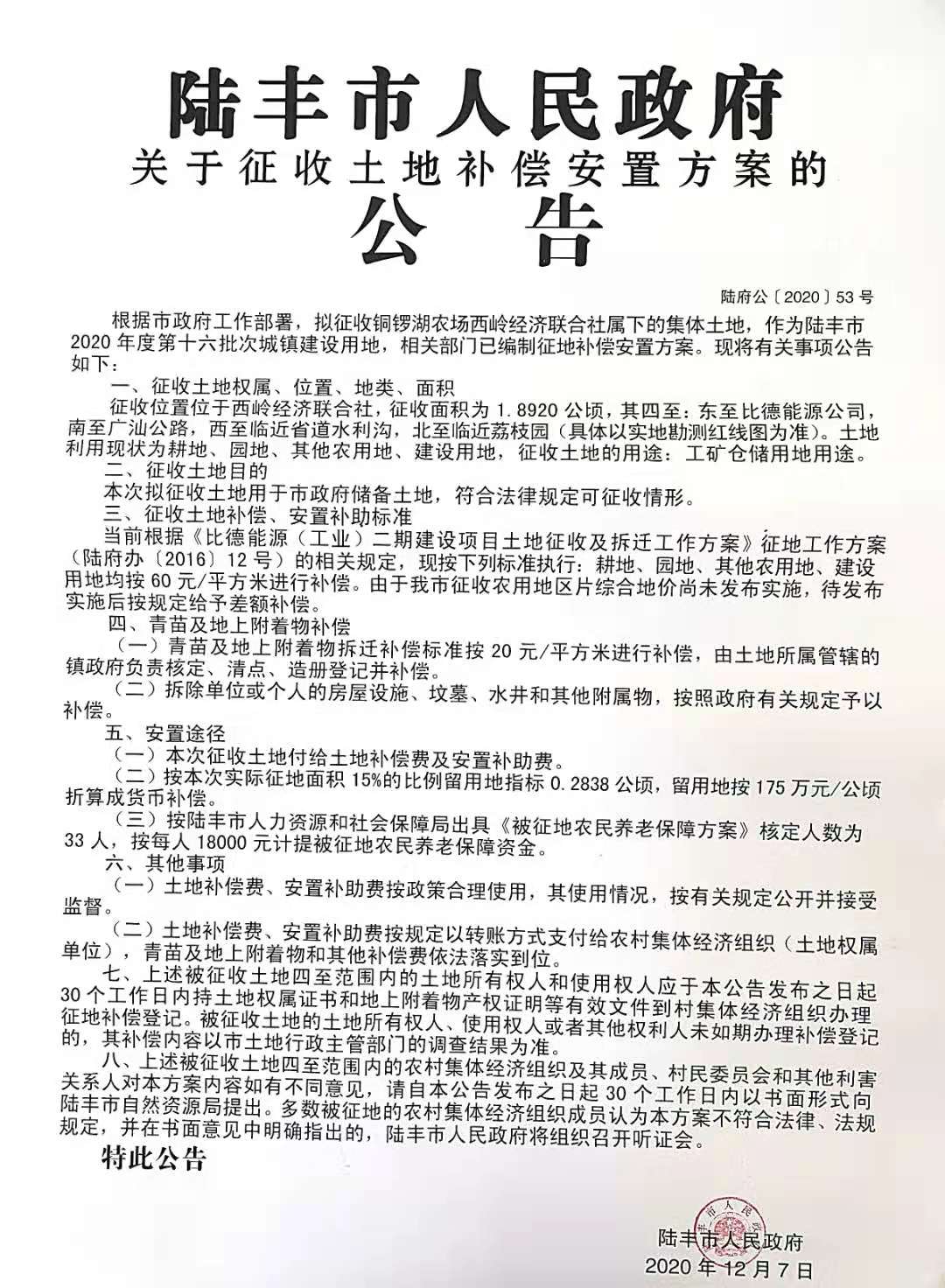 陸豐市人民政府關(guān)于征收土地補(bǔ)償安置方案的公告(陸府公[2020]53號(hào))