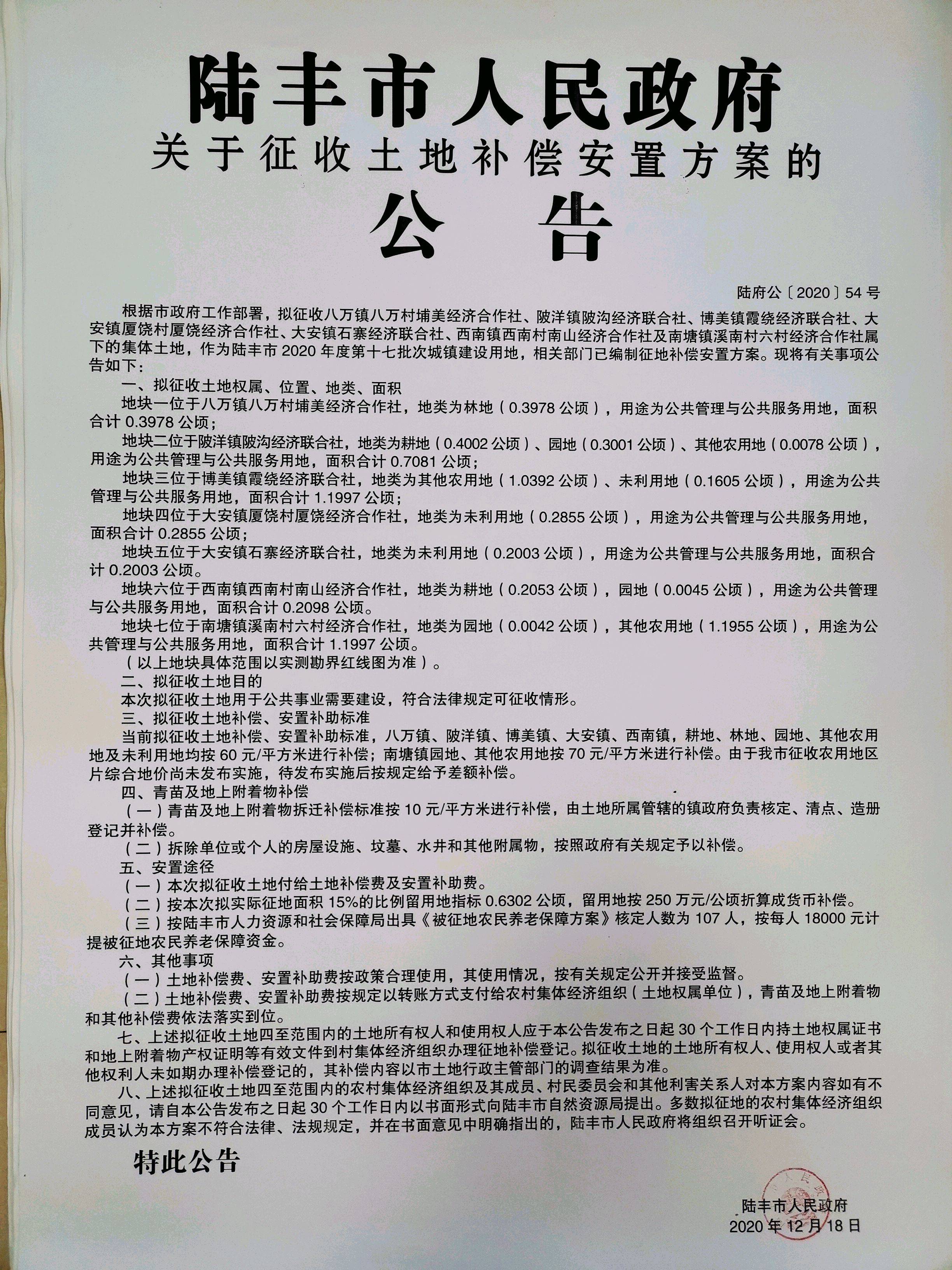 陸豐市人民政府關于征收土地補償安置方案的公告(陸府公[2020]54號)