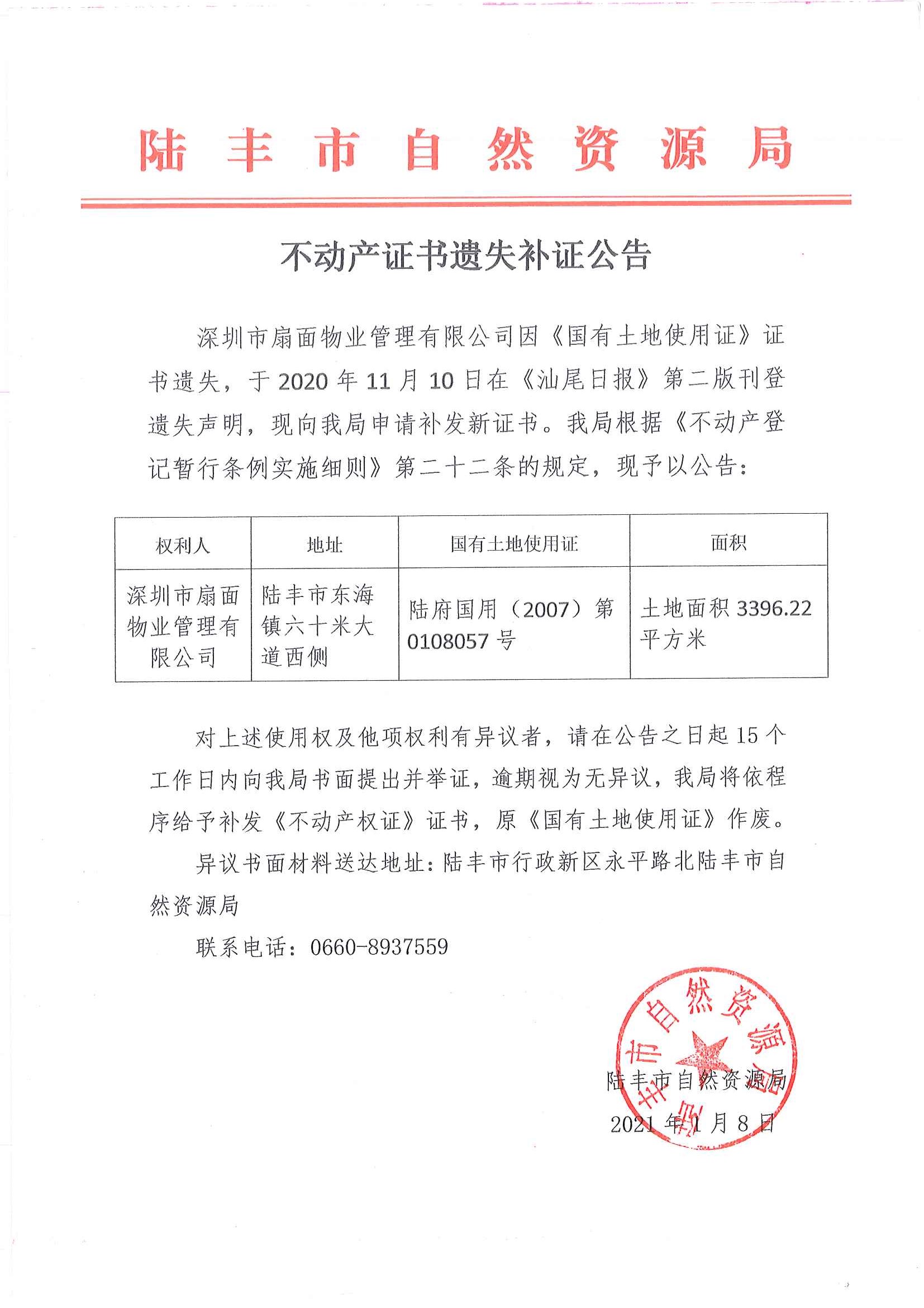 不動產(chǎn)證書遺失補(bǔ)證公告(深圳市扇面物業(yè)管理有限公司)