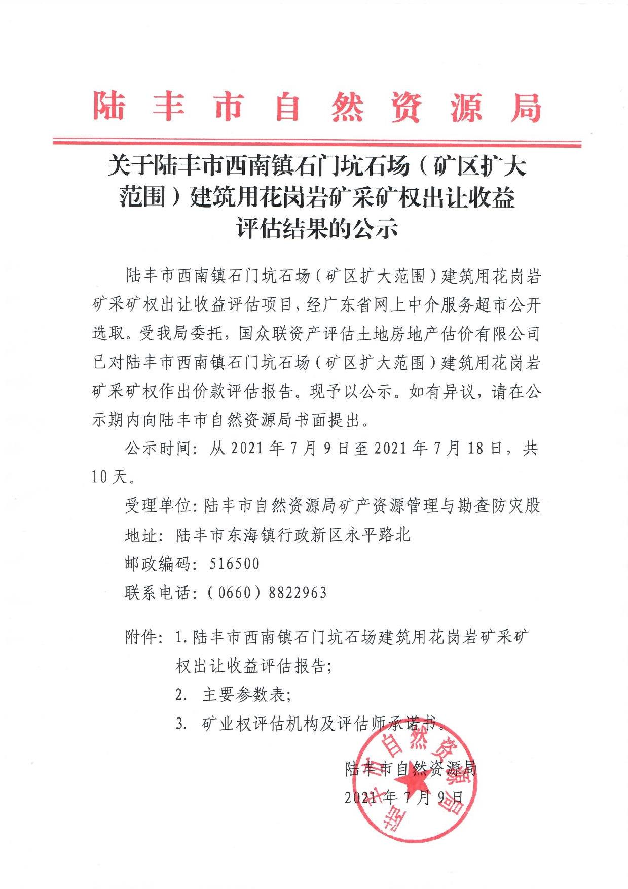 關(guān)于陸豐市西南鎮(zhèn)石門坑石場(礦區(qū)擴(kuò)大范圍)建筑用花崗巖礦采礦權(quán)出讓收益評(píng)估結(jié)果的公示