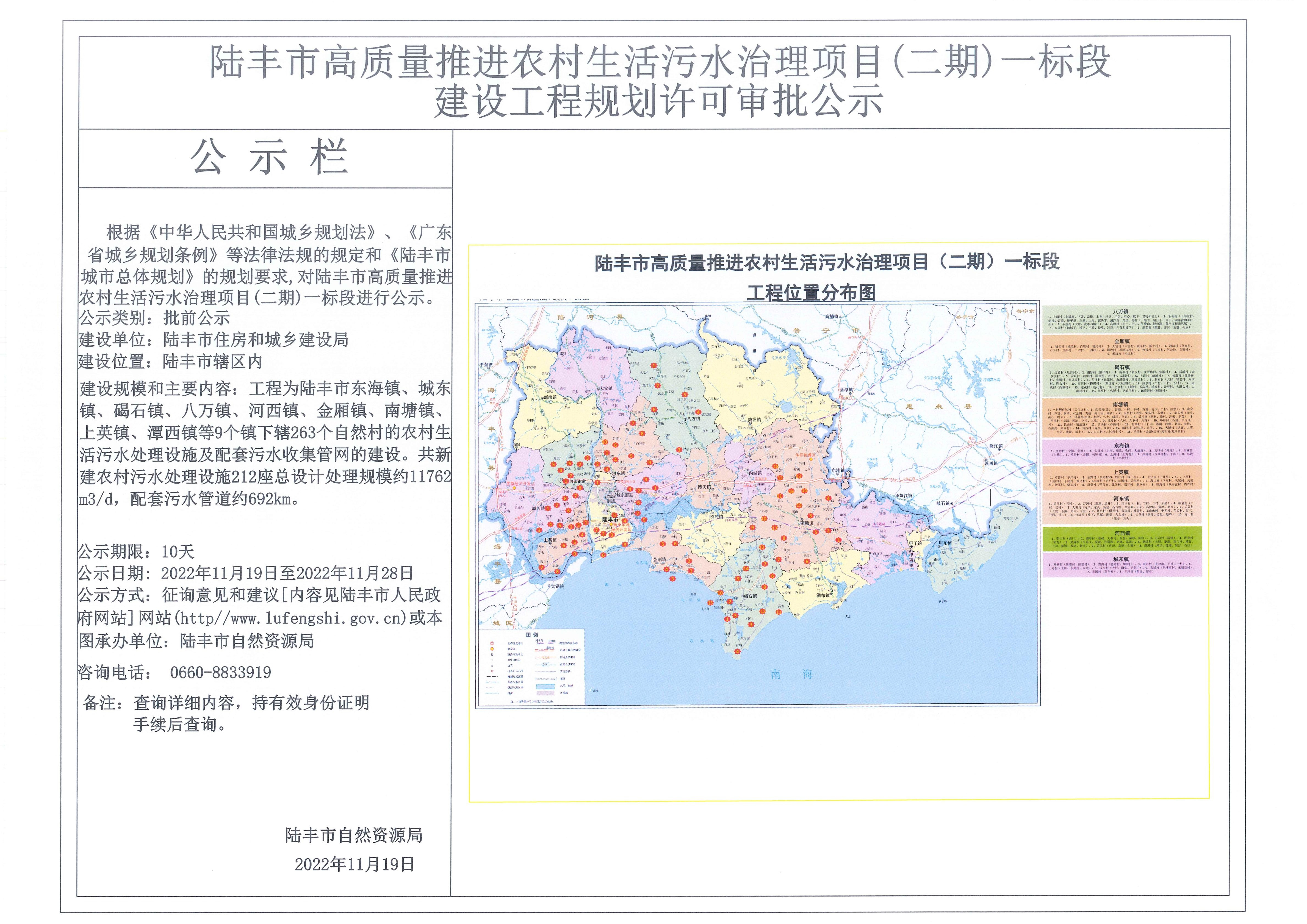 陸豐市高質(zhì)量推進(jìn)農(nóng)村生活污水治理項(xiàng)目(二期)一標(biāo)段建設(shè)工程規(guī)劃許可審批公示