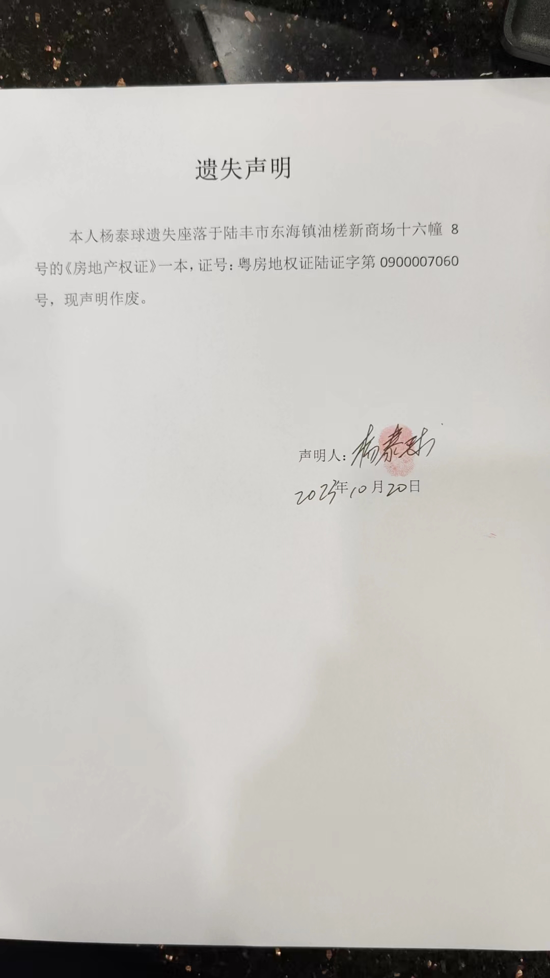 楊泰球因《房地產權證》遺失,現(xiàn)向我局申請補發(fā)新證書,根據(jù)《不動產登記暫行條例實施細則》第二十二條的規(guī)定,現(xiàn)公告作廢,如有異議,請自本公告之日起十五個工作日內(2023年11月10日之前)將異議書面材料送達我機構,逾期無人提出異議或者異議不成立的,我機構將予以補證登記。