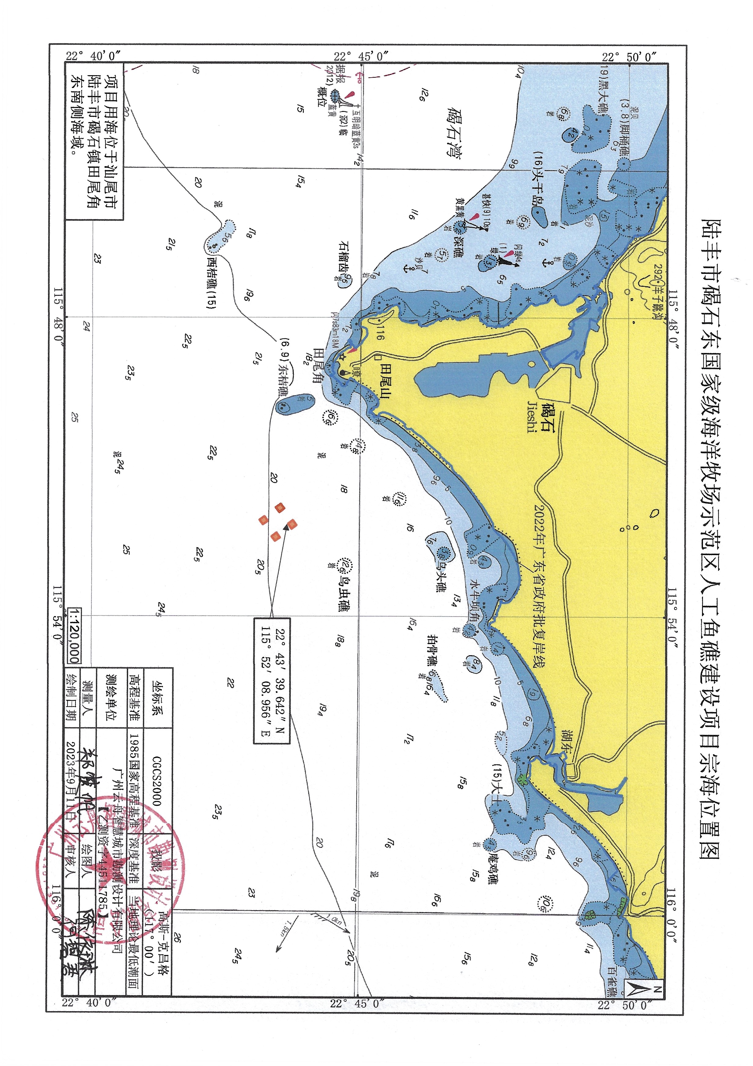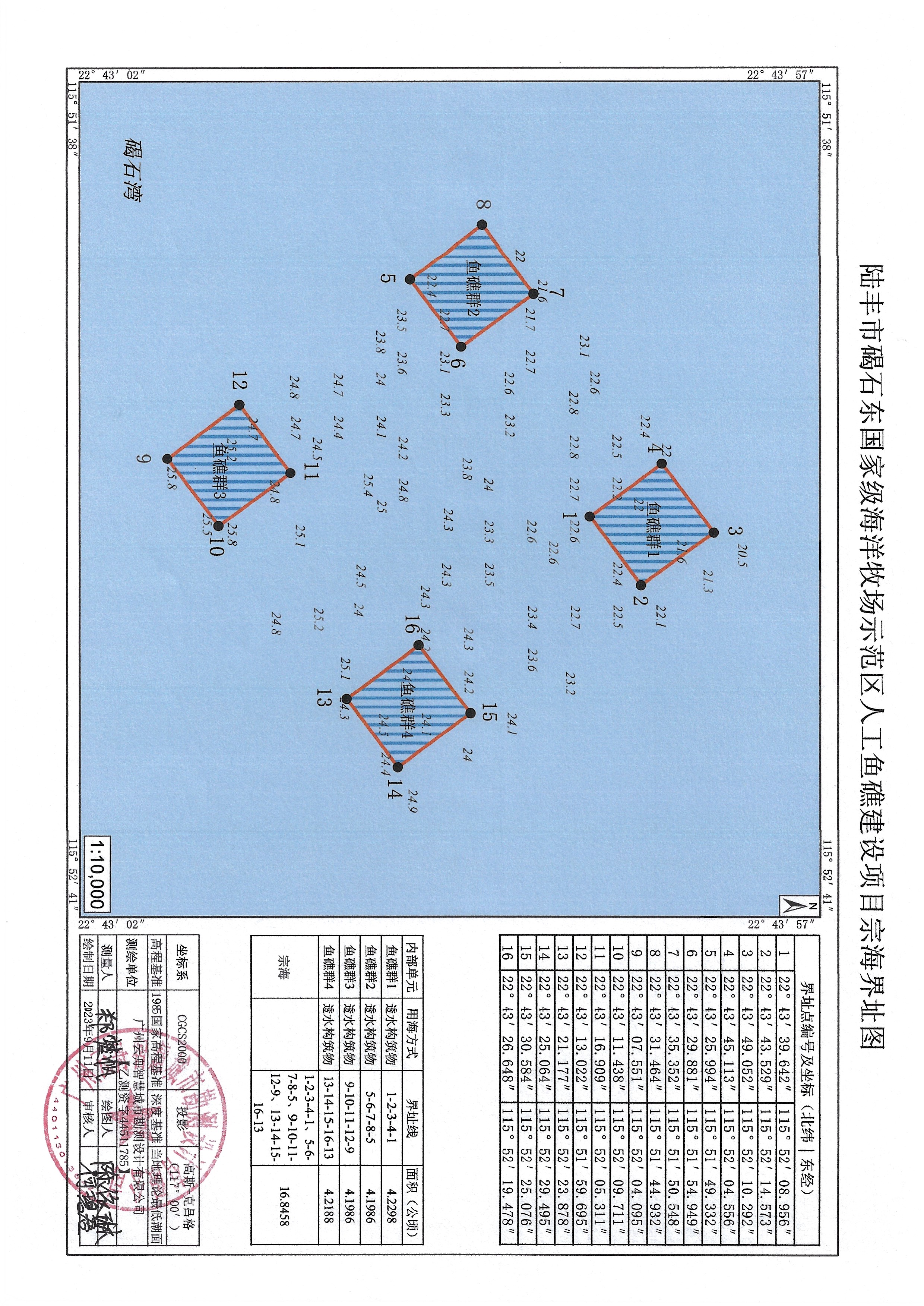 一、陸豐市碣石東國家級海洋牧場示范區(qū)人工魚礁建設項目位于陸豐市碣石灣田尾山東南側海域擬申請使用海域,用海面積為16.8458公頃,用海類型為漁業(yè)用海中的人工魚礁用海,使用方式為構筑物用海中的透水構筑物用海,用海申請期限為15年。具體界址點及坐標見附件。