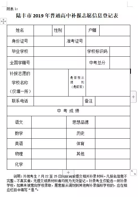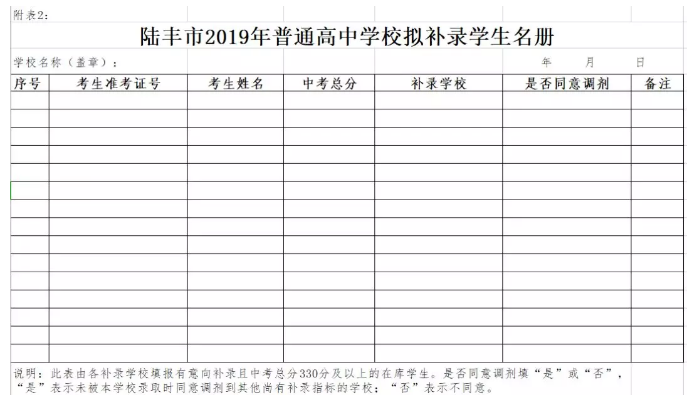 1.各初中及九年制學(xué)校應(yīng)及時通知未被普通高中錄取的在庫學(xué)生到各補錄學(xué)校登記。中考總分330分及以上的在庫學(xué)生名單由教育股發(fā)送至學(xué)籍群(用后即刪)。各補錄學(xué)校于7月25日上午11時前上報《陸豐市2019年普通高中學(xué)校擬補錄學(xué)生名冊》(附件2)一式兩份,同時發(fā)送電子檔至指定郵箱2994669651@qq.com,由教育股審核匯總后統(tǒng)一報送市教育局審批。