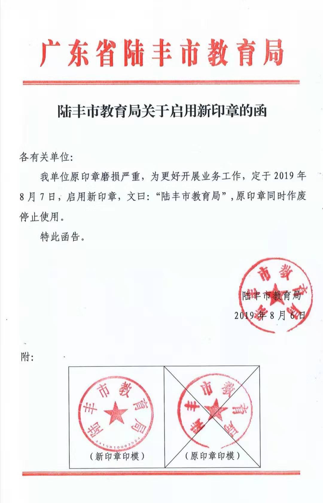 陸豐市教育局關(guān)于啟用新印章的函