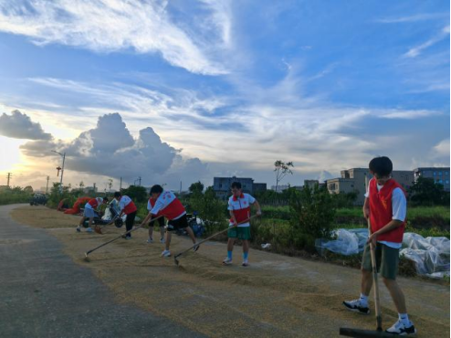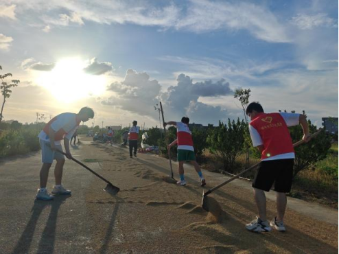活動結束,大學生志愿者一行人來到田野邊幫助村民晾曬稻谷,志愿者們在村民們的指導下翻、推、掃、堆……積極參與到農(nóng)作活動中來,感受豐收的喜悅。
