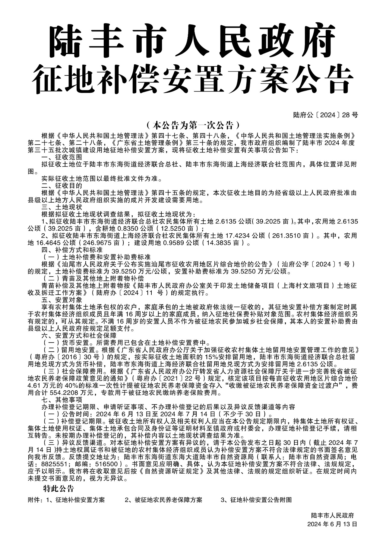 陸豐市人民政府征地補(bǔ)償安置方案公告