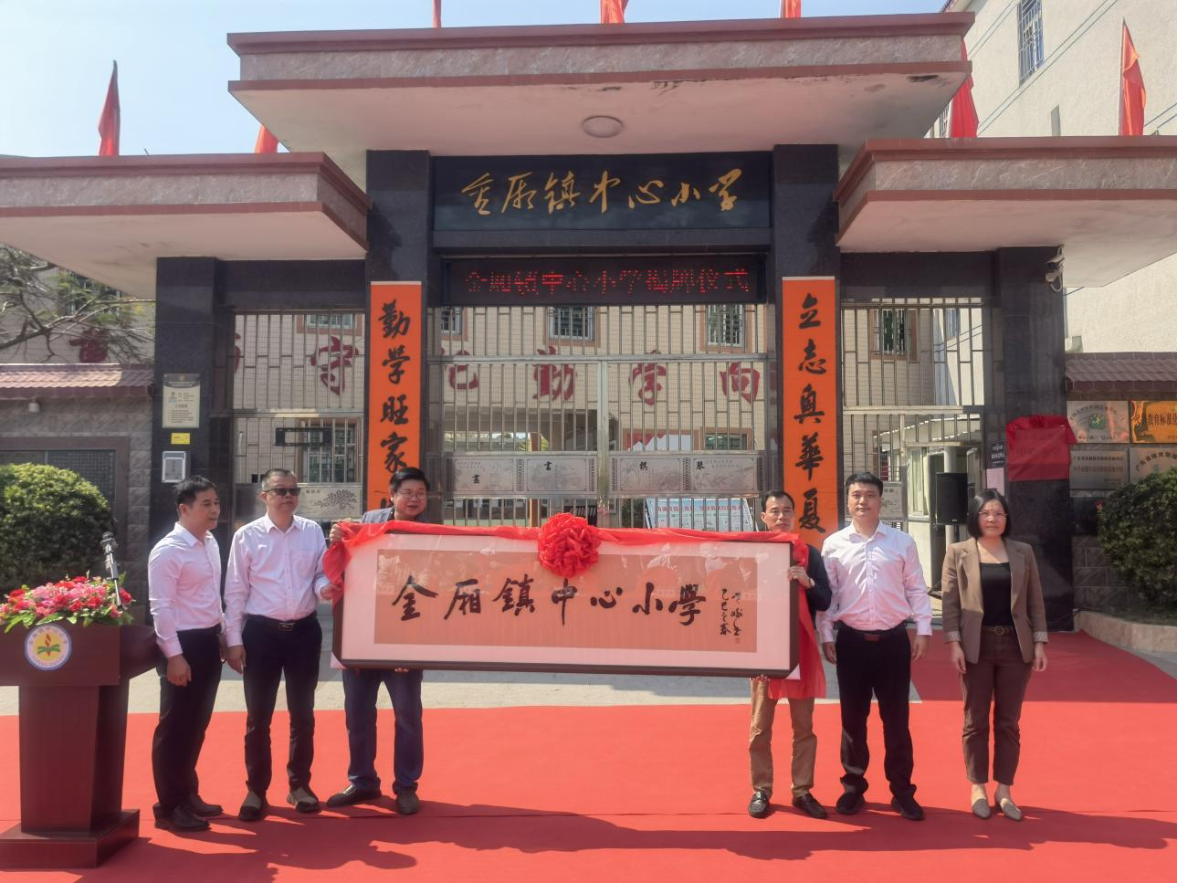 活動(dòng)現(xiàn)場(chǎng),原南方日?qǐng)?bào)社委、省書法家協(xié)會(huì)會(huì)員黃峨先生委托黃維樸同志向?qū)W校贈(zèng)送“金廂鎮(zhèn)中心小學(xué)”書法牌匾,筆力遒勁的題字寄托著對(duì)家鄉(xiāng)教育的殷切期望。洲渚村鄉(xiāng)賢黃寬鎮(zhèn)、黃建斌兩位先生合力捐贈(zèng)價(jià)值三萬元的速印機(jī),這是鄉(xiāng)賢們對(duì)金廂教育事業(yè)的肯定,更是為學(xué)校教學(xué)條件改善注入新動(dòng)能。