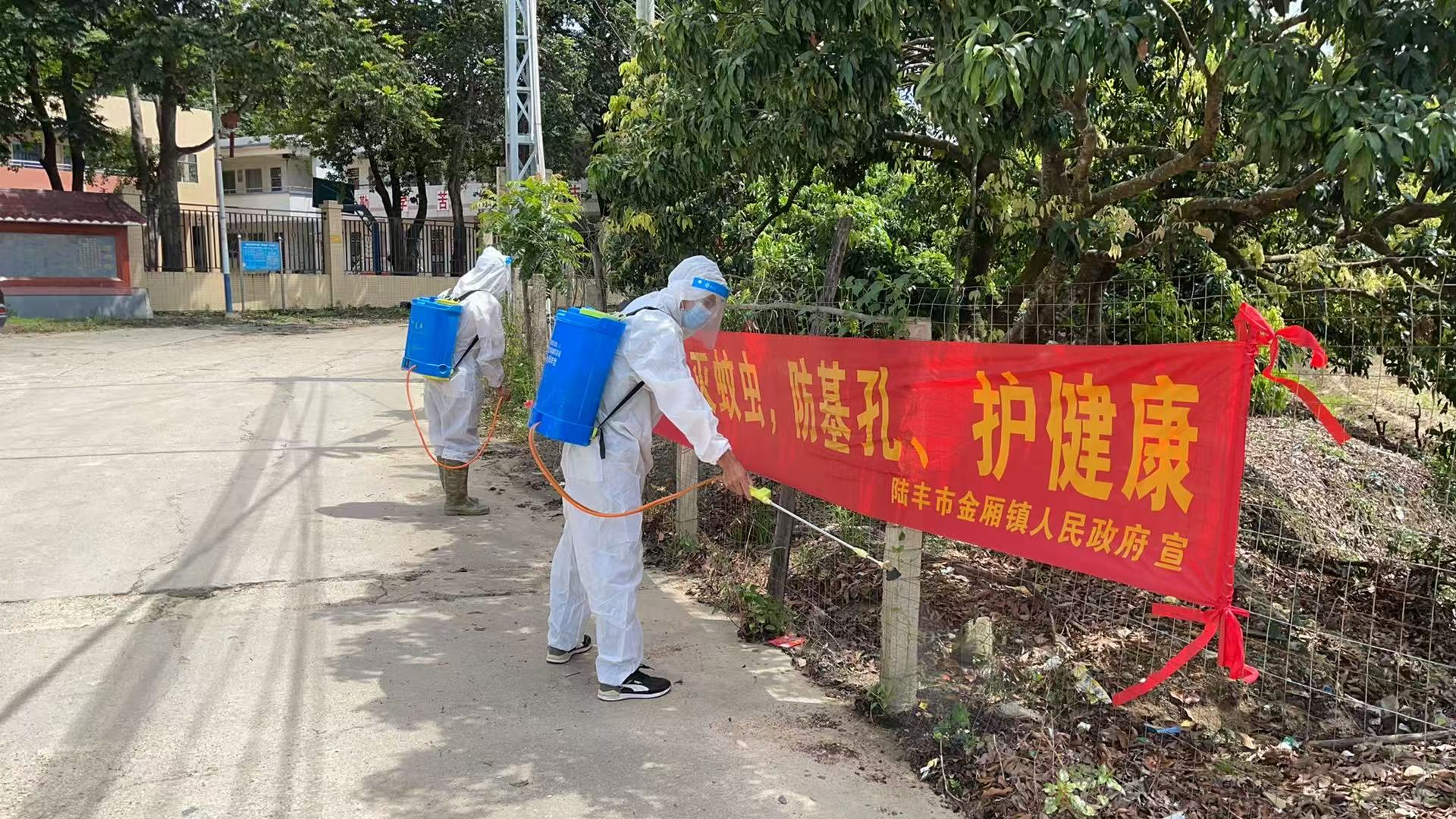 五、科學(xué)消殺 在市疾控中心指導(dǎo)下,金廂鎮(zhèn)構(gòu)建“空地一體、內(nèi)外銜接”的立體消殺格局:對(duì)開闊區(qū)域(道路、廣場、公共綠地)采用超低容量噴霧,于清晨及傍晚蚊蟲活躍時(shí)段實(shí)施空間噴灑;對(duì)密閉/半密閉環(huán)境(地下車庫、樓梯間、管道井、垃圾中轉(zhuǎn)站、市場內(nèi)部等)使用熱煙霧技術(shù);對(duì)成蚊棲息場所(綠化帶灌木、草叢、墻角、2米以下植被葉背、公共衛(wèi)生間、樓道、防撞輪胎內(nèi)部等)實(shí)施滯留噴灑,確保藥液均勻覆蓋;對(duì)持續(xù)高風(fēng)險(xiǎn)積水點(diǎn)(沙井、電纜井、集水井等)統(tǒng)一補(bǔ)投持效滅蚊幼顆粒劑。