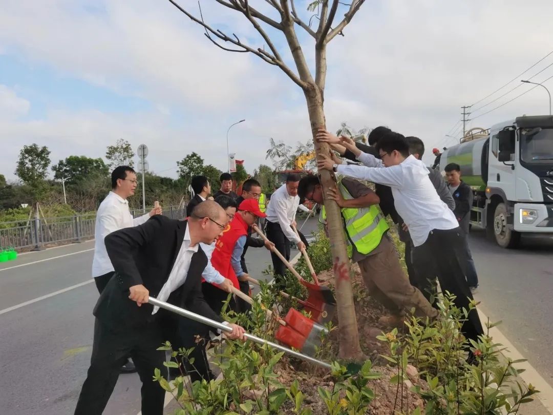 參加活動人員在甲港公路植樹現(xiàn)場,揮鍬鏟土、扶苗填土、提水澆灌、整地打穴,現(xiàn)場呈現(xiàn)一片熱火朝天的忙碌景象。