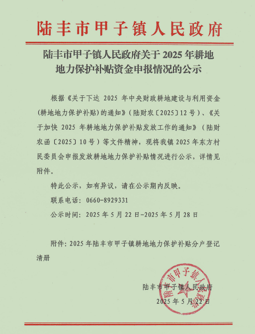 陸豐市甲子鎮(zhèn)人民政府關(guān)于 2025 年耕地地力保護(hù)補(bǔ)貼資金申報(bào)情況的公示