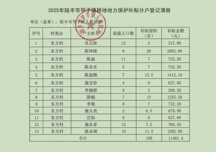 根據(jù)《關(guān)于下達(dá)2025年中央財(cái)政耕地建設(shè)與利用資金(耕地地力保護(hù)補(bǔ)貼)的通知》(陸財(cái)農(nóng)[2025]12號)、《關(guān)于加快 2025年耕地地力保護(hù)補(bǔ)貼發(fā)放工作的通知》(陸財(cái)農(nóng)函[2025]10號)等文件精神,現(xiàn)將我鎮(zhèn)2025年東方村民委員會申報(bào)發(fā)放耕地地力保護(hù)補(bǔ)貼情況進(jìn)行公示,詳情見下圖。