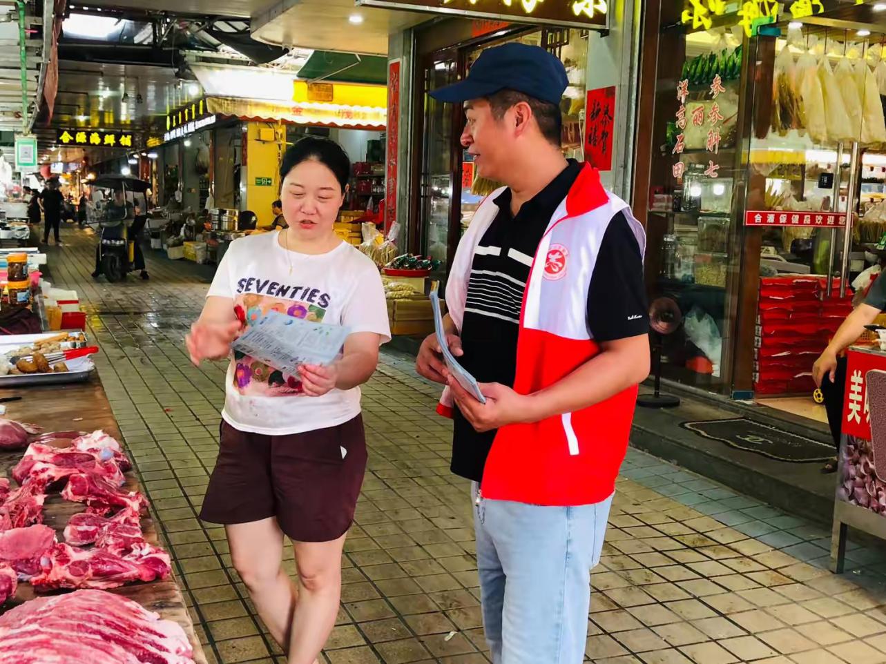 為確保重點(diǎn)區(qū)域防控?zé)o死角,志愿者走進(jìn)市場(chǎng),向攤主與顧客普及防控知識(shí)。在市場(chǎng)內(nèi),志愿者與攤主親切交流,了解日常經(jīng)營情況,并發(fā)放宣傳資料。市場(chǎng)內(nèi)人來人往,攤位上擺滿新鮮蔬菜與肉類,志愿者與群眾互動(dòng)頻繁,現(xiàn)場(chǎng)氣氛活躍。
