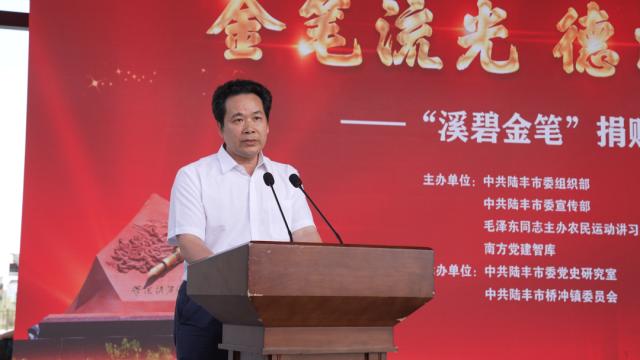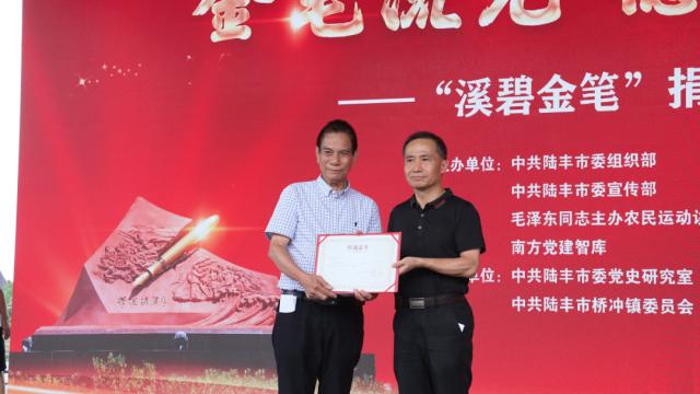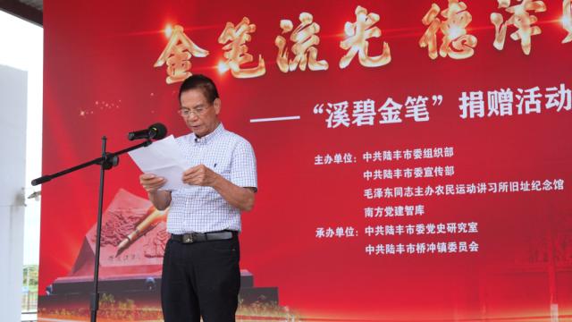 8月1日上午,由陸豐市委組織部、陸豐市委宣傳部、廣州農(nóng)講所紀(jì)念館、南方黨建智庫聯(lián)合主辦的“金筆流光 德澤貽遠(yuǎn)——‘溪碧金筆’捐贈活動”在汕尾陸豐市橋沖鎮(zhèn)溪碧村舉行。南方報業(yè)傳媒集團(tuán)副總編輯、南方雜志社黨委書記、社長陳廣騰,廣州農(nóng)講所紀(jì)念館館長顏暉,陸豐市人大常委會主任彭薏菁,陸豐市委副書記陳建華等出席活動。