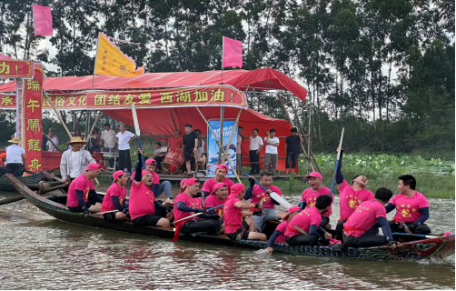端午節(jié)(6月10日)當天,我鎮(zhèn)長安村委西湖村在東溪河開展一場龍舟賽事。在陣陣鑼鼓聲中,選手整齊劃一,龍舟在河道中央爭相競渡。河岸兩邊,村民駐足觀看,為參賽選手擂鼓吶喊?,F(xiàn)場鼓聲、吆喝聲、助威聲交織成一片,熱鬧非凡。