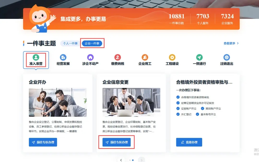 點(diǎn)擊“企業(yè)一件事”—“準(zhǔn)入準(zhǔn)營”—“企業(yè)信息變更”—“前往專區(qū)辦理”