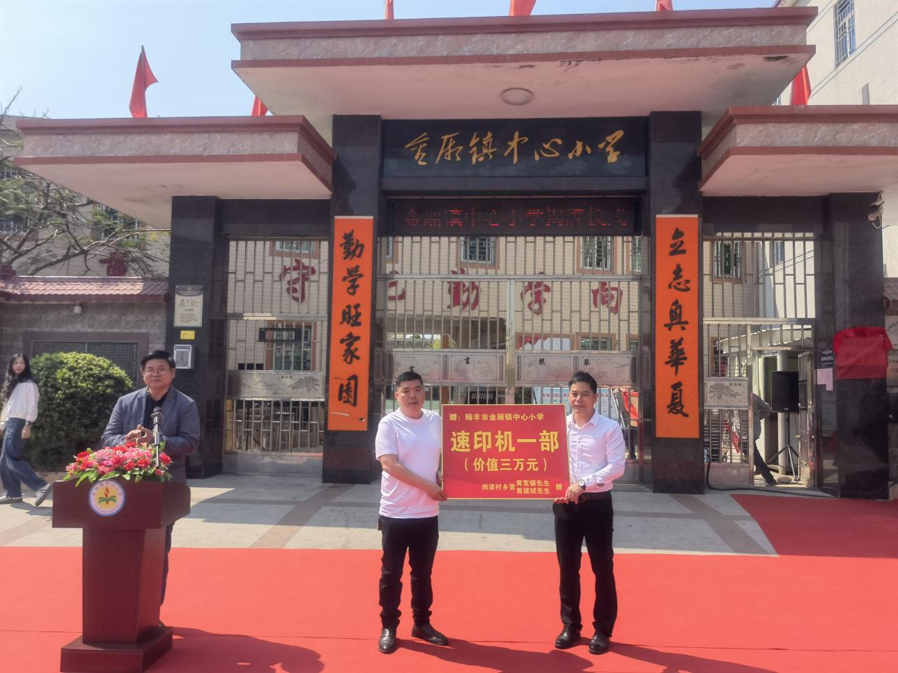活動現場,原南方日報社委、省書法家協(xié)會會員黃峨先生委托黃維樸同志向學校贈送“金廂鎮(zhèn)中心小學”書法牌匾,筆力遒勁的題字寄托著對家鄉(xiāng)教育的殷切期望。洲渚村鄉(xiāng)賢黃寬鎮(zhèn)、黃建斌兩位先生合力捐贈價值三萬元的速印機,這是鄉(xiāng)賢們對金廂教育事業(yè)的肯定,更是為學校教學條件改善注入新動能。