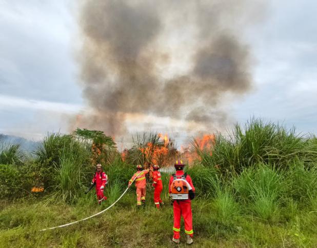 救援隊伍快速到達火情發(fā)生所在位置,根據現場研判,起火位置植被旺盛,火勢蔓延迅速,距離配電設施約300米,火點旁有一處河流可取水。決定使用2部滅火水泵以水滅火快速控制火勢,輔助使用風力滅火機縮小火勢蔓延范圍。經過緊張有序的撲救,明火已被徹底撲滅,明火撲滅后,現場人員對火場進行了全面細致的檢查清理,防止火場復燃。
