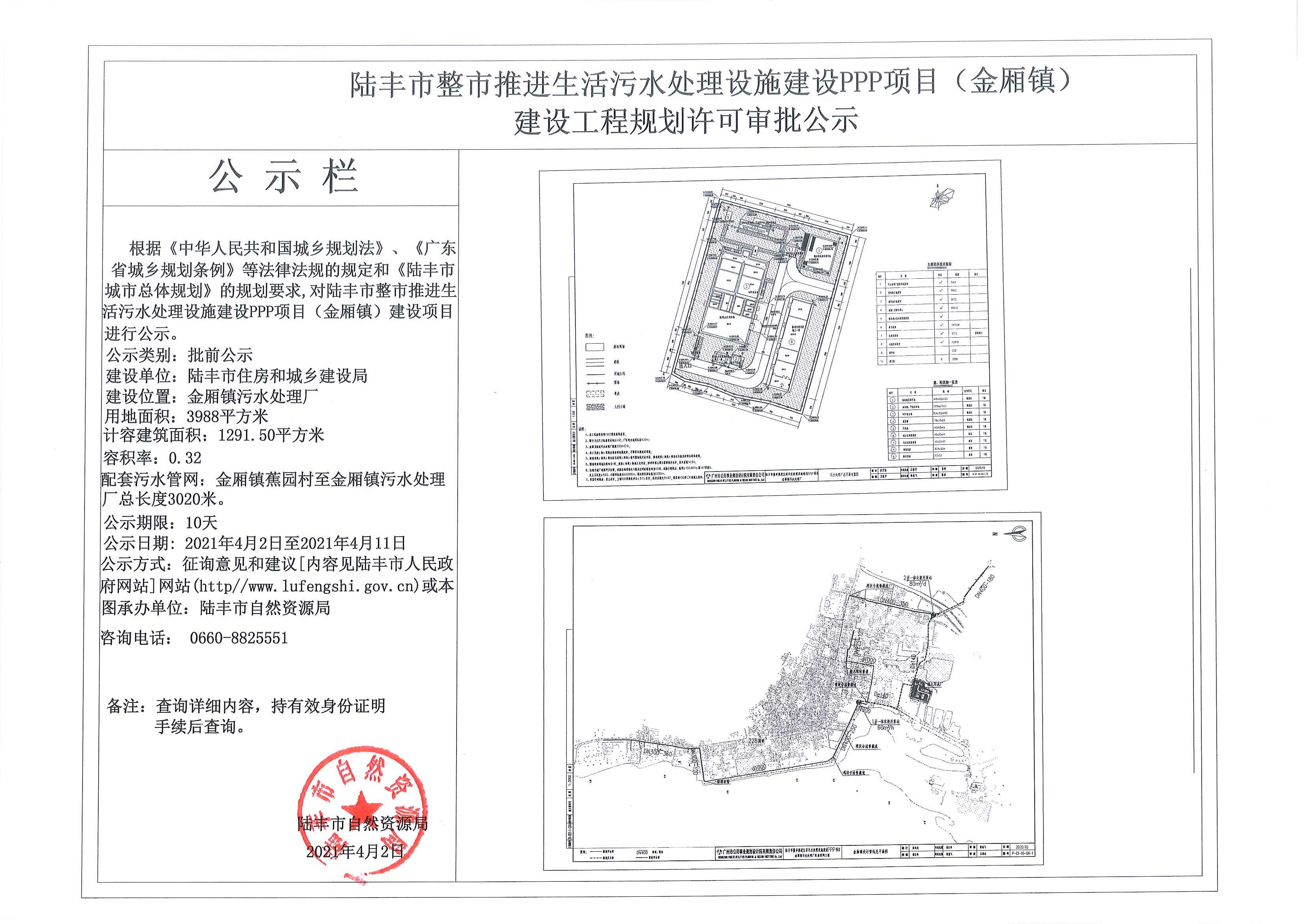 陸豐市整市推進(jìn)生活污水處理設(shè)施建設(shè)PPP項(xiàng)目(金廂鎮(zhèn))建設(shè)工作規(guī)劃許可審批公示