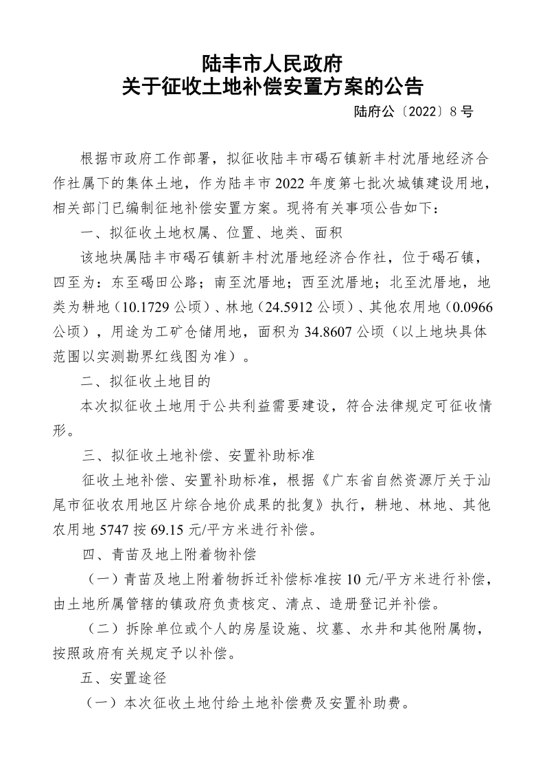 陸豐市人民政府關(guān)于征收土地補償安置方案的公告(陸府公〔2022〕8 號)