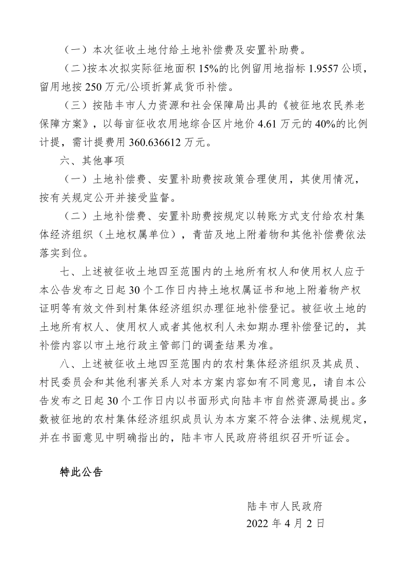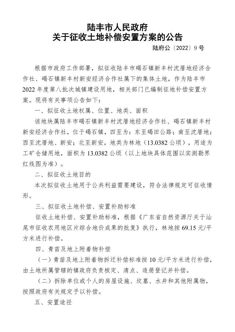 陸豐市人民政府關(guān)于征收土地補(bǔ)償安置方案的公告(陸府公〔2022〕9 號(hào))