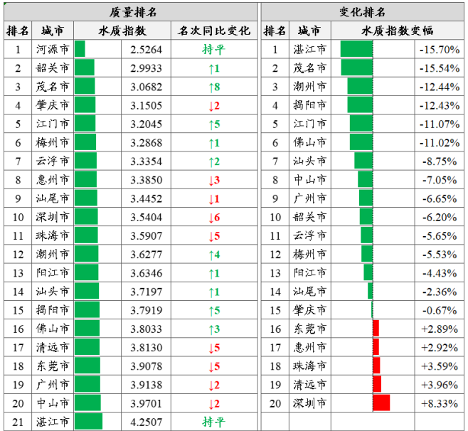 城市排名:基于270個省考斷面水質(zhì)監(jiān)測結(jié)果,按照城市水質(zhì)指數(shù)由低到高排名,全省水環(huán)境質(zhì)量前三名為河源、韶關(guān)和茂名市,后三名由高到低為湛江、中山和廣州市。湛江、茂名和潮州等15市水環(huán)境質(zhì)量同比有所改善,深圳、清遠(yuǎn)和珠海等5市同比有所下降(河源市所有省考斷面均達到水質(zhì)目標(biāo)且均達到或優(yōu)于Ⅱ類,不參與水質(zhì)變化排名)。