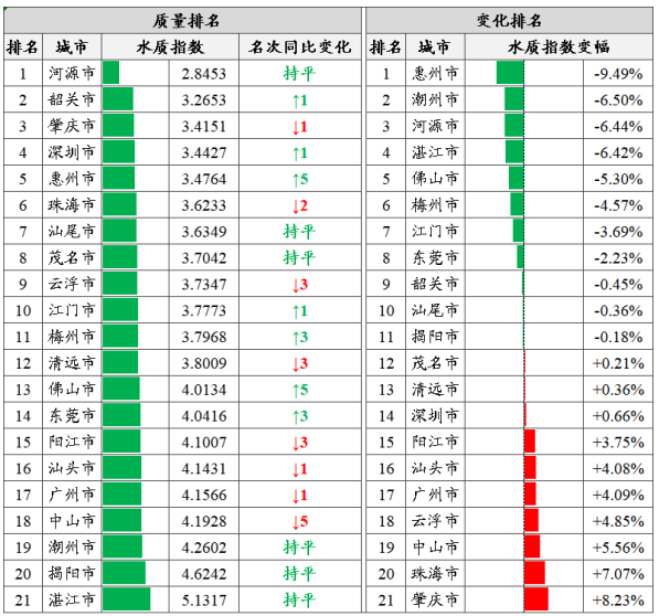 城市排名:基于270個(gè)省考斷面水質(zhì)監(jiān)測結(jié)果,按照城市水質(zhì)指數(shù)由低到高排名,全省水環(huán)境質(zhì)量前三名為河源、韶關(guān)和肇慶市,后三名由高到低為湛江、揭陽和潮州市?;葜?、潮州和河源等11市水環(huán)境質(zhì)量同比有所改善,肇慶、珠海和中山等10市同比有所下降。