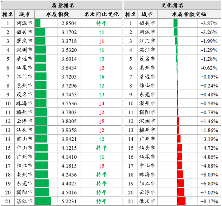 城市排名:基于270個省考斷面水質監(jiān)測結果,按照城市水質指數(shù)由低到高排名,全省水環(huán)境質量前三名為河源、韶關和肇慶市,后三名由高到低為湛江、揭陽和東莞市。韶關、河源和江門等6市水環(huán)境質量同比有所改善,肇慶、云浮和陽江等15市同比有所下降。