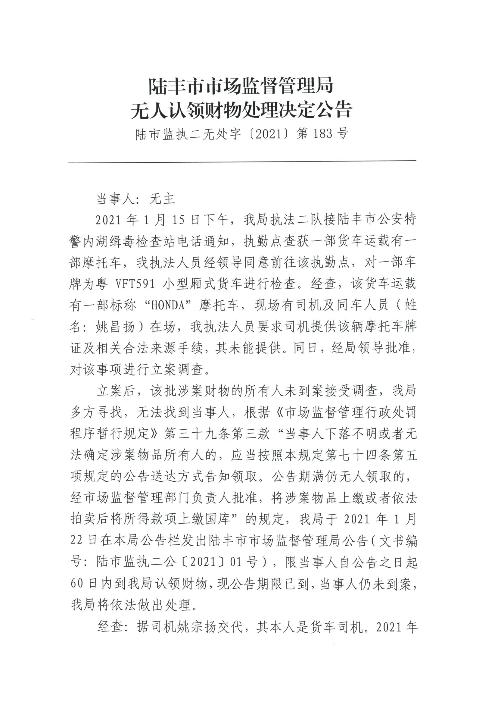 陸豐市市場監(jiān)督管理局無人認(rèn)領(lǐng)財物處理決定公告