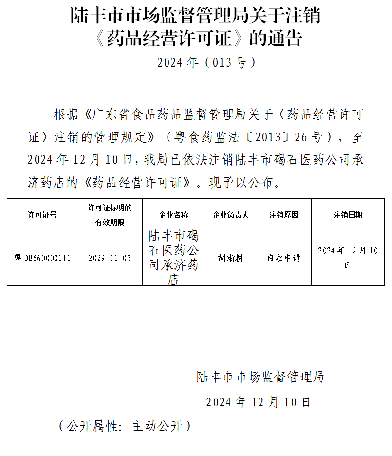 陸豐市市場(chǎng)監(jiān)督管理局關(guān)于注銷《藥品經(jīng)營(yíng)許可證》的通告