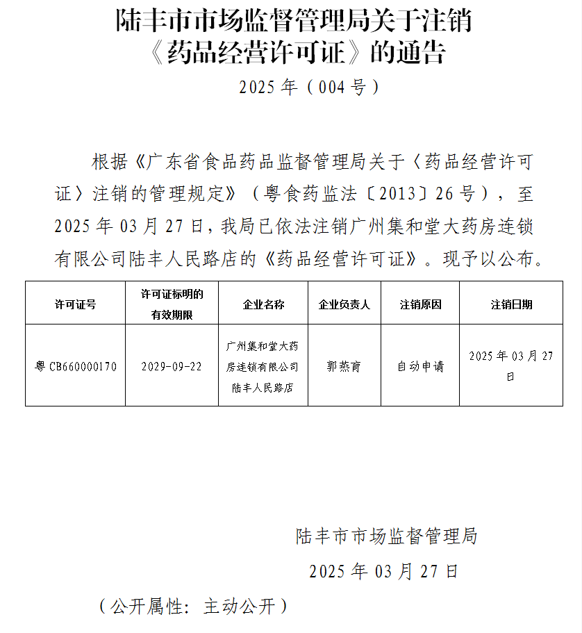 陸豐市市場監(jiān)督管理局關(guān)于注銷《藥品經(jīng)營許可證》的通告