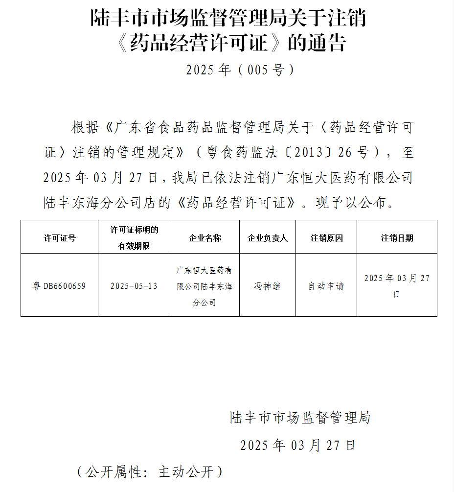 陸豐市市場(chǎng)監(jiān)督管理局關(guān)于注銷《藥品經(jīng)營(yíng)許可證》的通告