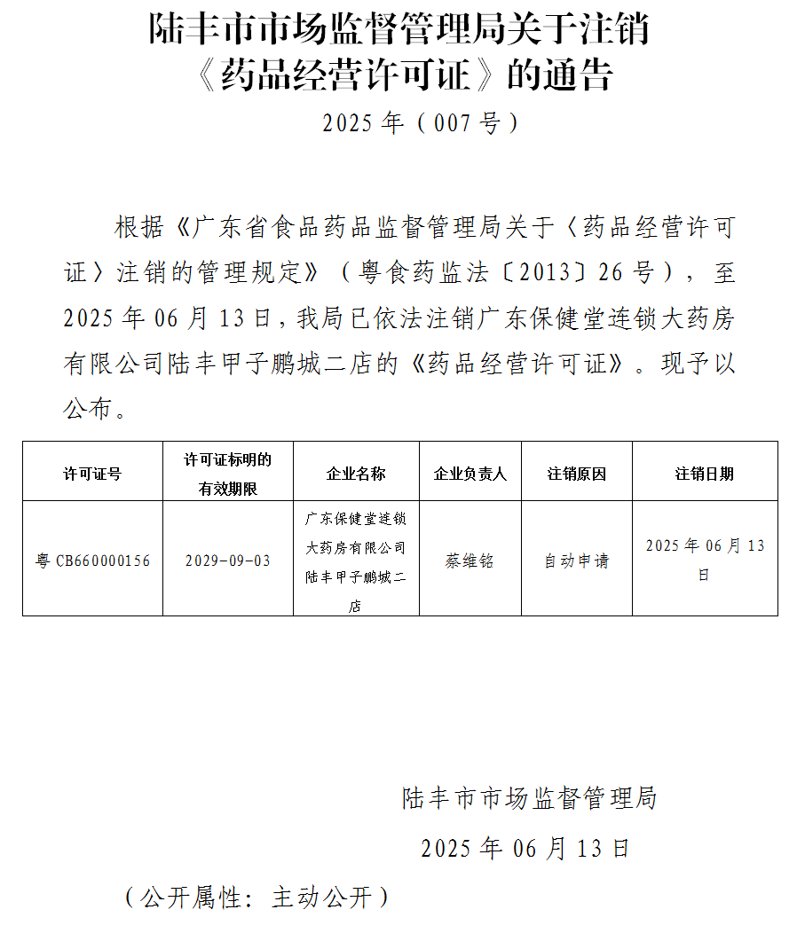 陸豐市市場(chǎng)監(jiān)督管理局關(guān)于注銷《藥品經(jīng)營(yíng)許可證》的通告