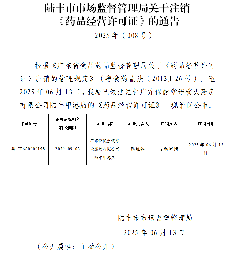陸豐市市場監(jiān)督管理局關(guān)于注銷《藥品經(jīng)營許可證》的通告