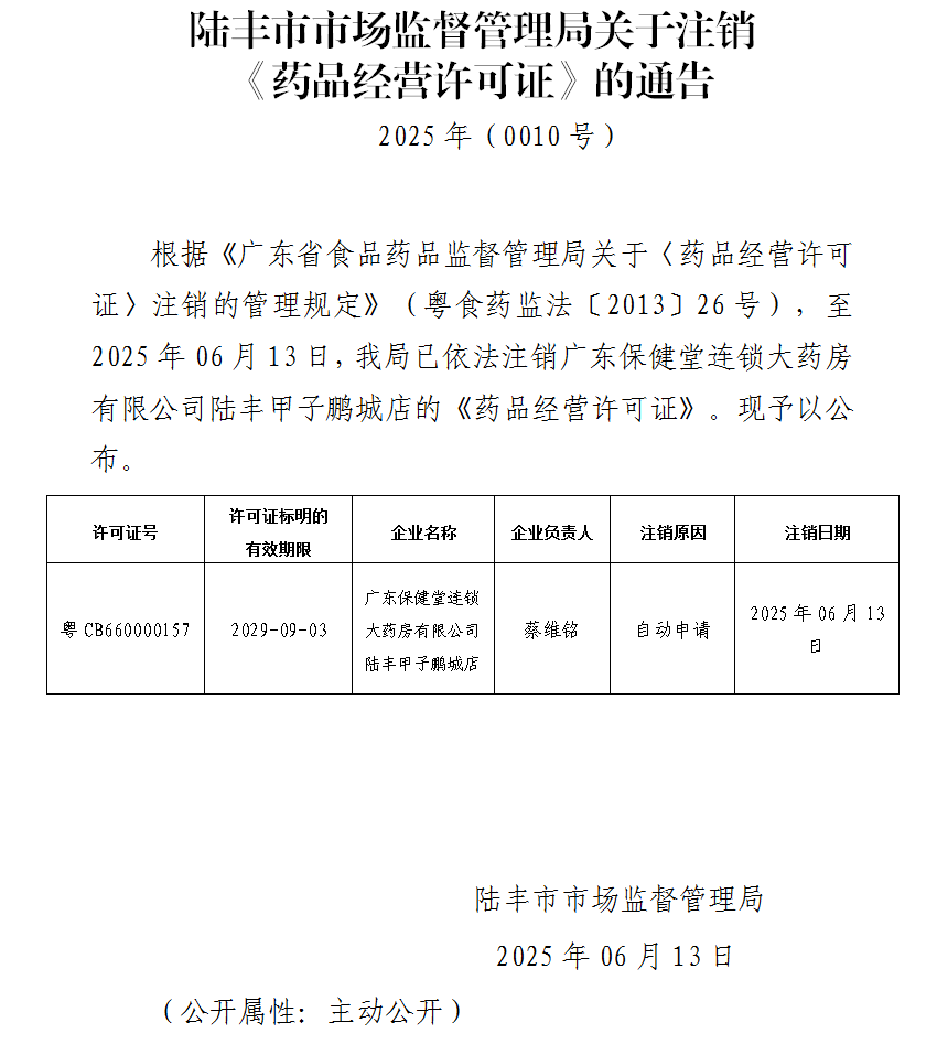 陸豐市市場(chǎng)監(jiān)督管理局關(guān)于注銷(xiāo)《藥品經(jīng)營(yíng)許可證》的通告
