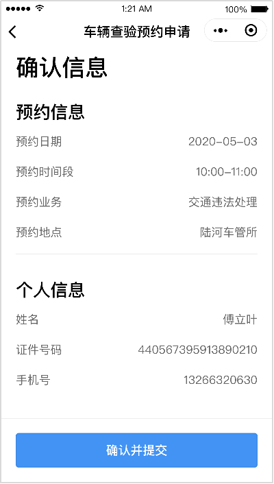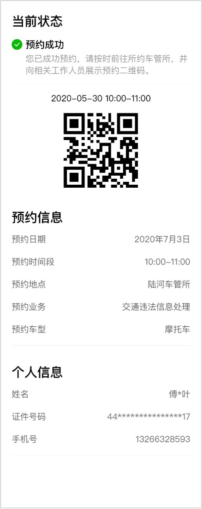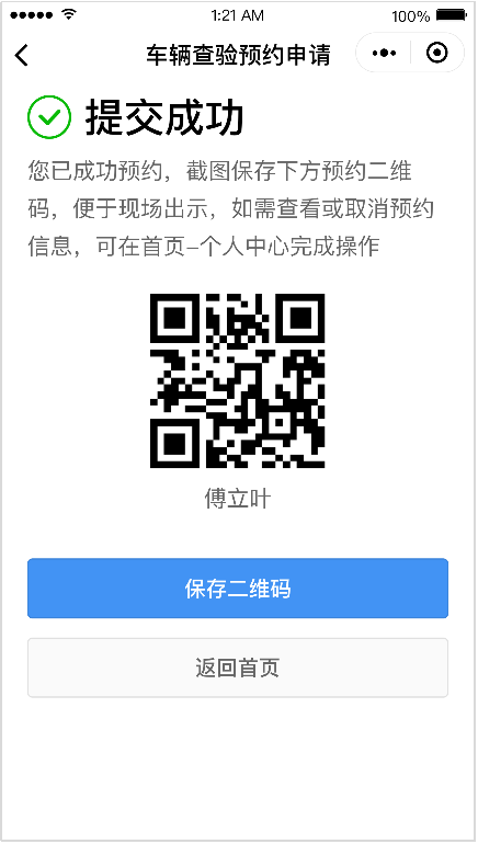 閱讀預(yù)約須知后,點(diǎn)擊“開(kāi)始預(yù)約”進(jìn)入預(yù)約界面,準(zhǔn)確填寫(xiě)預(yù)約車(chē)型、業(yè)務(wù)、時(shí)間、地點(diǎn)等信息,并進(jìn)行提交。提交成功后,將生成預(yù)約二維碼。在到達(dá)車(chē)管所現(xiàn)場(chǎng)后出示預(yù)約信息,以供檢驗(yàn)員檢驗(yàn)預(yù)約情況。