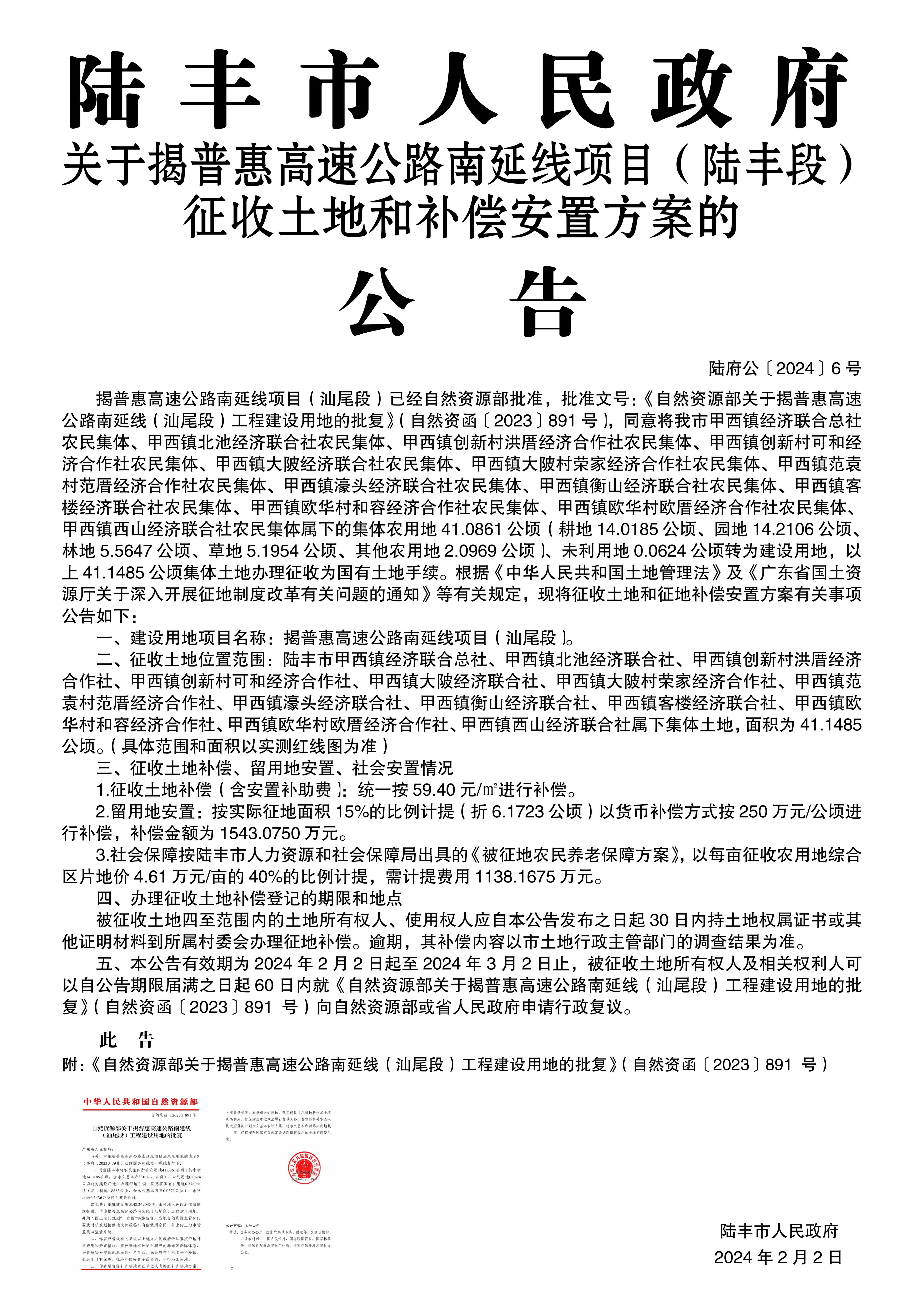 陸豐市人民政府關于揭普惠高速公路南延線項目(陸豐段)征收土地和補償安置方案的公告(陸府公〔2024〕6號)