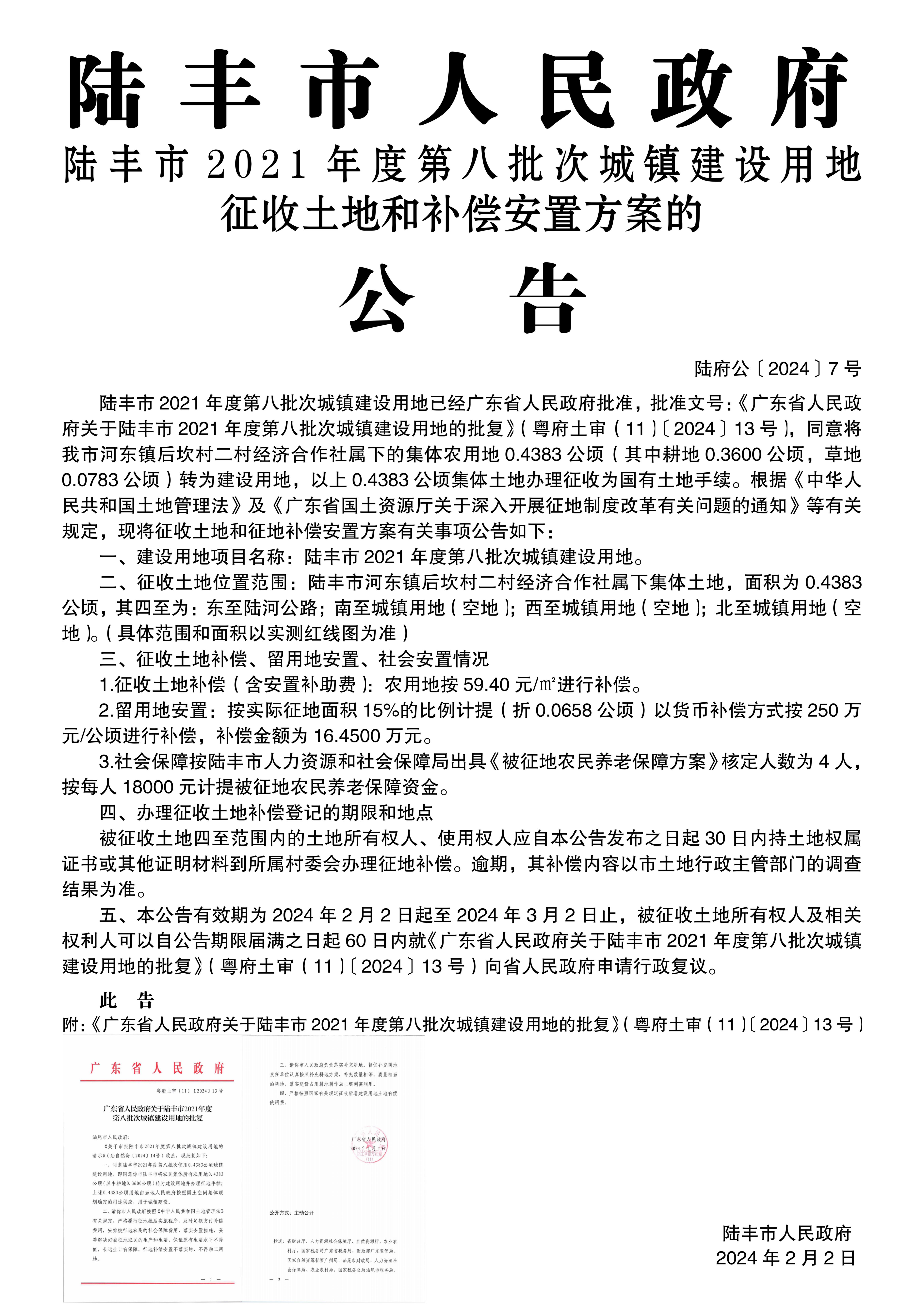 廣東省人民政府關(guān)于陸豐市 2021年度第八批次城鎮(zhèn)建設(shè)用地的批復(fù)(粵府土審(11)〔2024〕13號(hào))