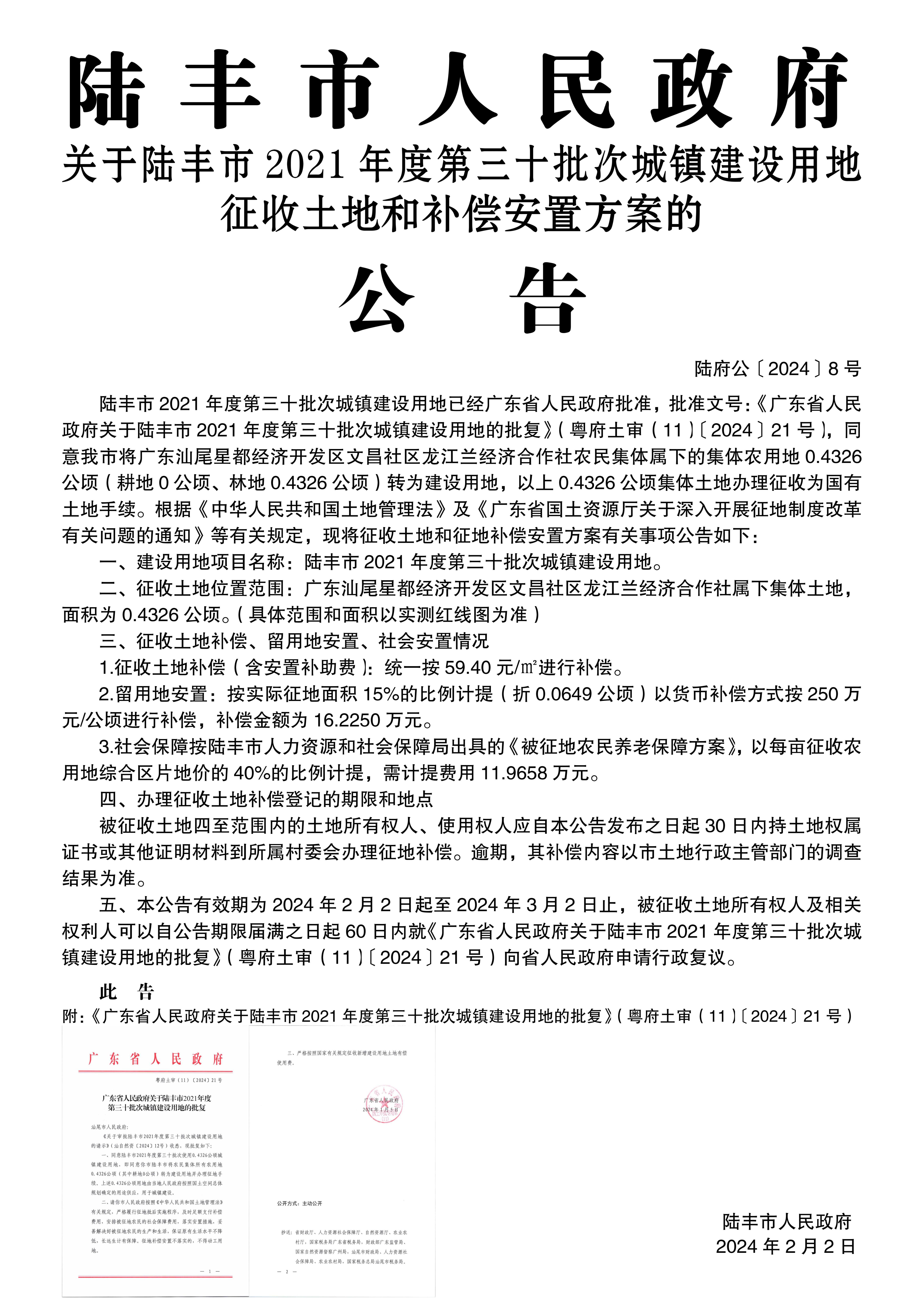廣東省人民政府關(guān)于陸豐市 2021年度第三十批次城鎮(zhèn)建設(shè)用地的批復(fù)(粵府土審(11)〔2024〕21號)