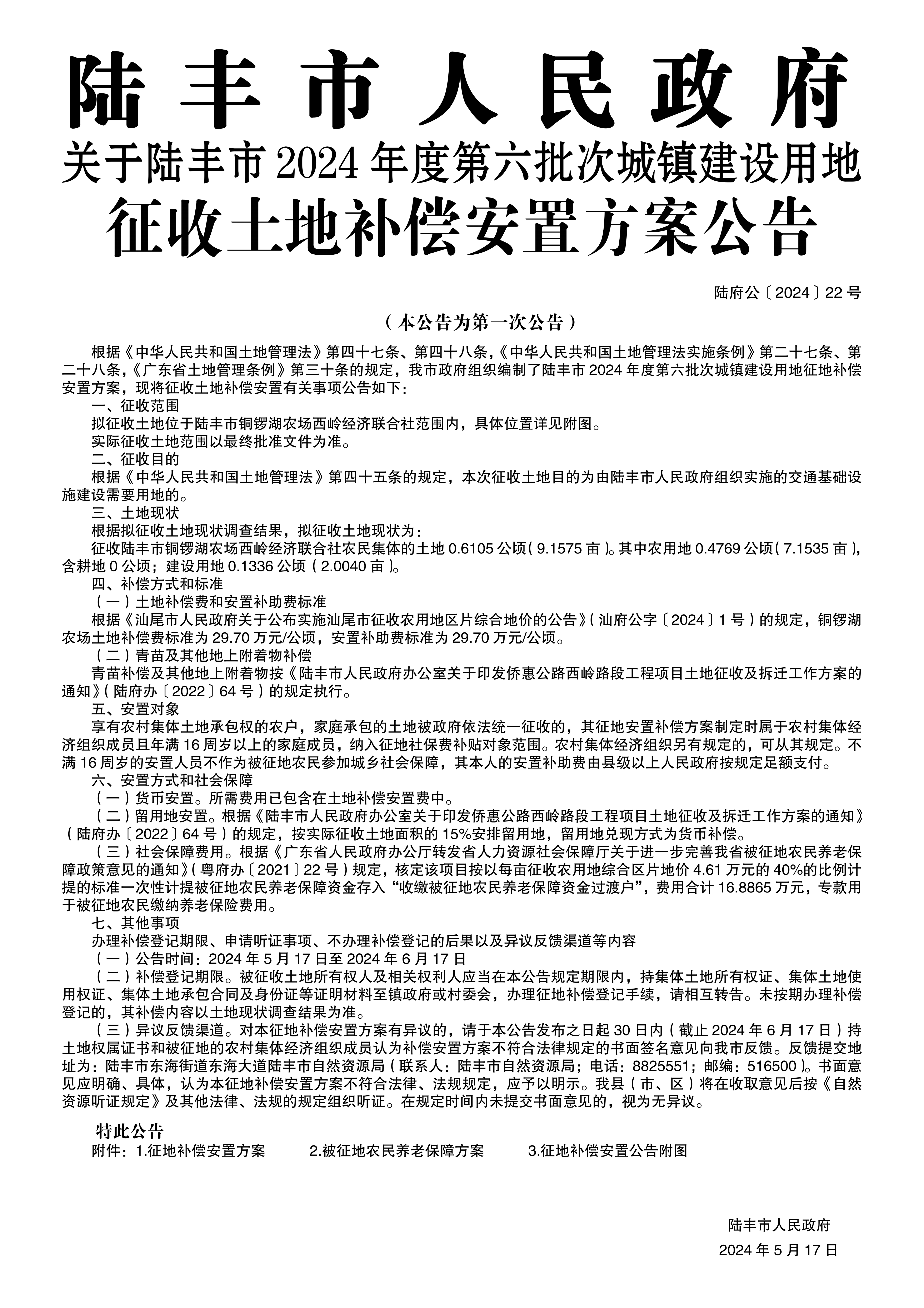 陸豐市人民政府關(guān)于陸豐市2024年度第六批次城鎮(zhèn)建設(shè)用地征收土地補(bǔ)償安置方案公告(陸府公[2024]22號(hào))