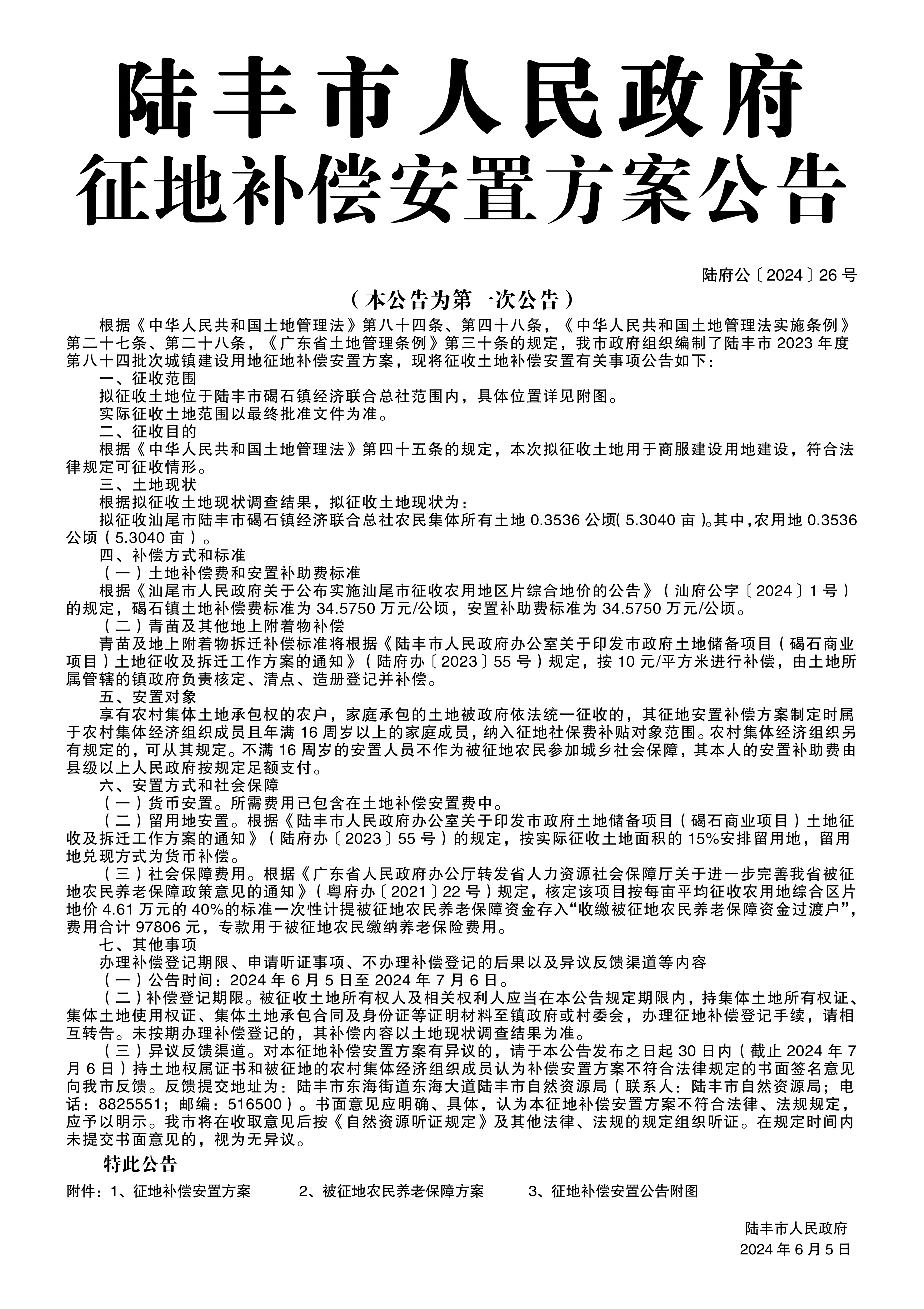 陸豐市人民政府征地補(bǔ)償安置方案公告(陸府公〔2024〕26號)