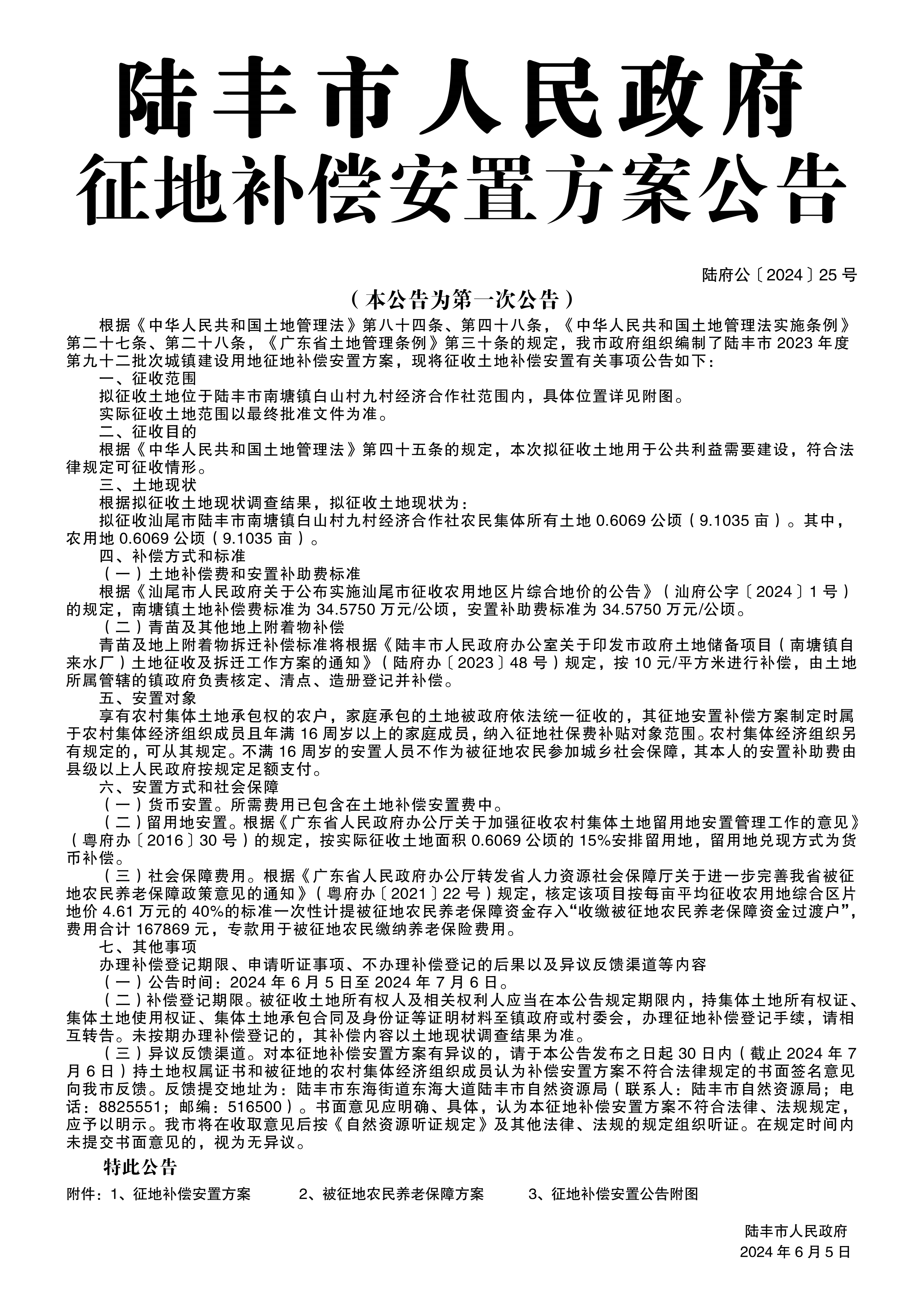 陸豐市人民政府征地補(bǔ)償安置方案公告(陸府公〔2024〕25號(hào))