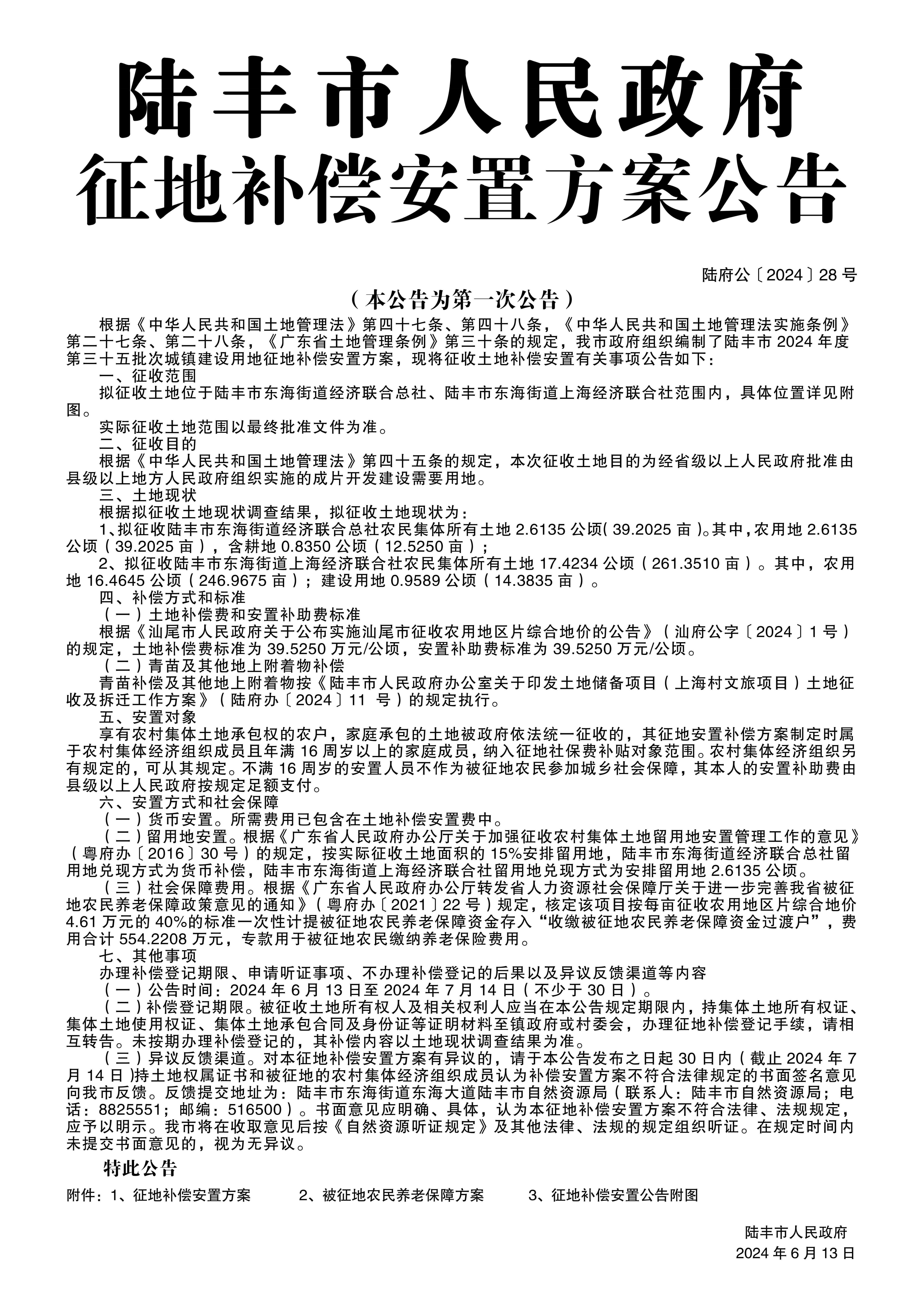 陸豐市人民政府征收補償安置方案公告(陸府公〔2024〕28號)