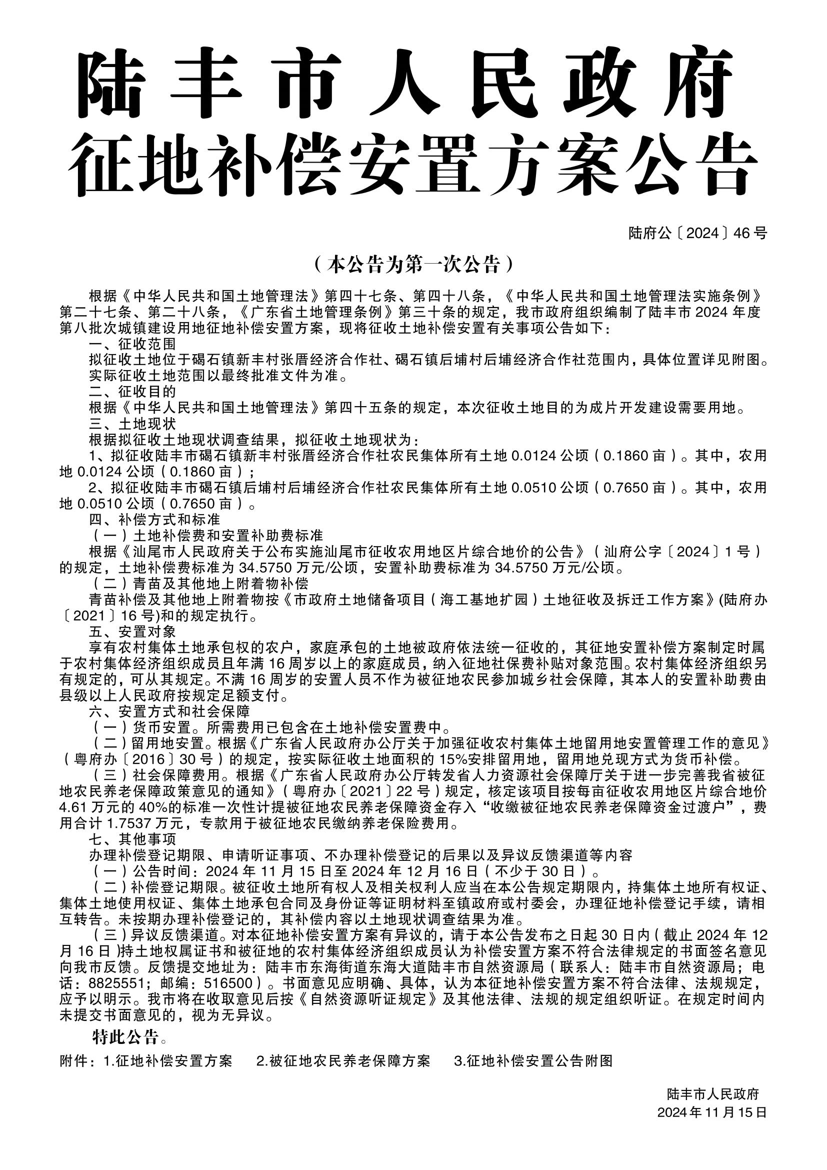 陸豐市人民政府征收土地和補(bǔ)償安置方案公告(陸府公〔2024〕46號(hào))
